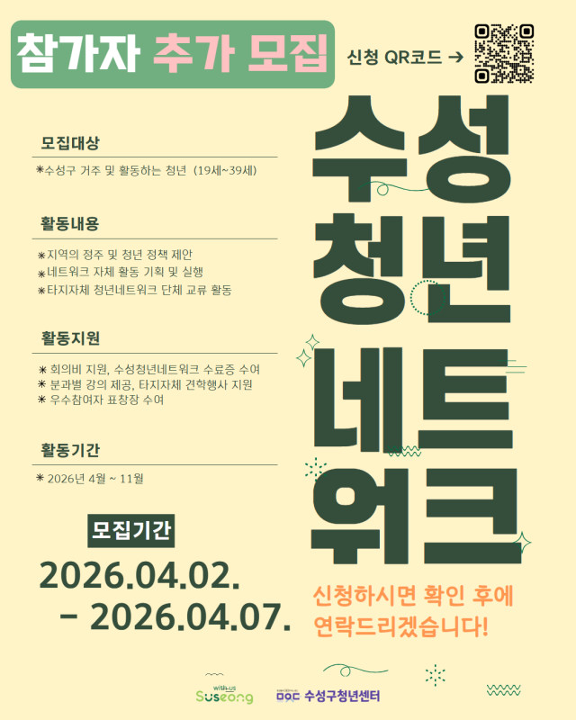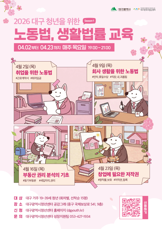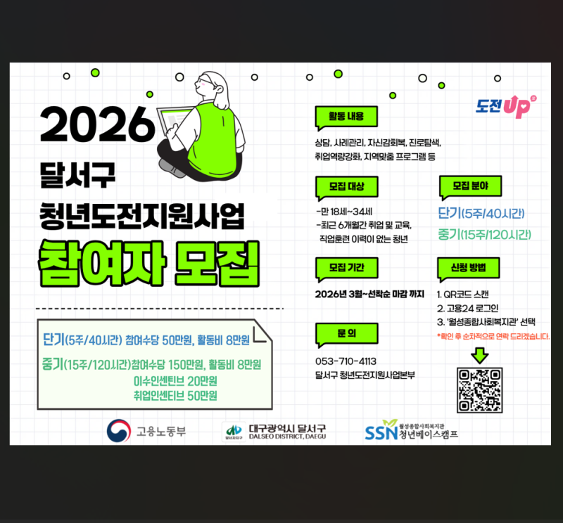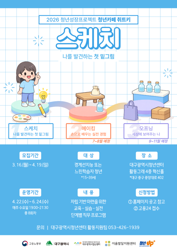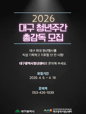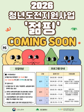 본문 메인 슬라이드 배너 이전 다음 청년들이 함께 상상하고 협업하여 더 높게 점프할 수 있는 열린 공간, 젊프로 점프하자! 더보기 + 청년을 위한 놓칠 수 없는 꿀정보 한가득 현재 모집 중 더보기+ 진행중 (모집중) 진로 설정반 모집!!! 자기이해부터 진로설정, 최신 채용 트렌드까지 나만의 진로 로드맵 완성하기 대구동구청년센터the꿈 진행중 2026년 청년도전지원사업 단기 모집중!! 달서구청년도전지원사업본부 진행중 기업의 재발견 특강 계명대학교 일자리첫걸음보장센터 진행중 2026 지역 연계 동아리 지원 사업 동아리원 모집 대구광역시청소년문화의집 꼼지락발전소 진행중 "우쿨렐레 일상의BGM이 되다" 1인가구 청년 참여자 모집 서구제일종합사회복지관 진행중 [1인가구지원사업] "하루에 한점" 청년 참여자 모집 서구제일종합사회복지관 진행중 [1인가구지원사업] "실로 엮는 이야기" 청년 참여자 모집 서구제일종합사회복지관 진행중 [정규과정] 발레 (성인반/키즈반) 대구중구생활문화센터 트랜디한 감각으로 무장한 전문가 청년 프리랜서 전통 향도를 통해 선비들이 즐기던 향기로 문향하고, 향기 처방으로 심리를 치유합니다. 평점 0.0 50,000원~ 귀여운 3d모델링을 합니다. 평점 0.0 50,000원~ 웹소설과 관련된 여러 업무가 가능합니다. 평점 0.0 10,000원~ 사진과 일러스트를 조합해 새로운 이미지를 만들어드립니다 평점 0.0 80,000원~ 신입/경력 취업용 포트폴리오를 제작해드립니다. 평점 0.0 50,000원 트렌디하고 감각적인 비주얼 포스터 디자인해 드립니다 평점 0.0 400,000원 (협의) 성우, 크리에이터, 라이브커머스 진행 평점 0.0 50,000원 여러분들이 찾고 계신 바로 그 성우입니다! 평점 0.0 50,000원~ 상세내용보기 청년정책꿀팁 청년커뮤니티 청년공간 청년단체 청년상담소
