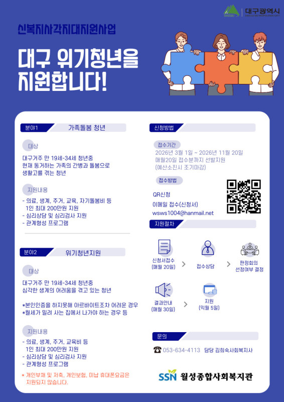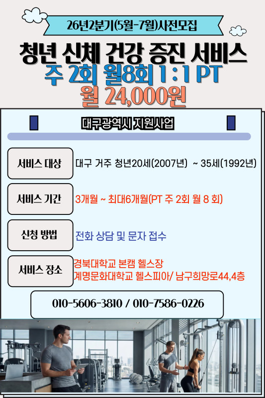 본문 메인 슬라이드 배너 이전 다음 청년들이 함께 상상하고 협업하여 더 높게 점프할 수 있는 열린 공간, 젊프로 점프하자! 더보기 + 청년을 위한 놓칠 수 없는 꿀정보 한가득 현재 모집 중 더보기+ 진행중 [해피파트너스] 4월 네트워킹파티 서구종합사회복지관 진행중 (모집중) 진로 설정반 모집!!! 자기이해부터 진로설정, 최신 채용 트렌드까지 나만의 진로 로드맵 완성하기 대구동구청년센터the꿈 진행중 월24,000원 / 2026년 대구 청년신체건강증진서비스 이용자 사전모집 월성종합사회복지관(청년베이스캠프) 진행중 [오션캠퍼스] 영덕, 울진 스쿠버다이빙 인턴십 참가자 모집 (~04/16) 사회적협동조합 오션캠퍼스 진행중 2026 남구자원봉사 아카데미 네일아트 수강생 모집 대구남구자원봉사센터 진행중 [2026년 칠곡 청년정책참여단] 모집 칠곡군 청년센터 진행중 대구시 가족돌봄 청년 , 위기청년을 지원합니다 월성종합사회복지관 진행중 대구 청년신체건강증진서비스 26년 2분기 사전접수 (1:1 PT개인레슨 / 헬스 / 다이어트 / 체형교정) 헬스케어(경북대학교헬스장 / 계명문화대학교헬스피아 / 남구 희망로 44, 4층) 트랜디한 감각으로 무장한 전문가 청년 프리랜서 클라이언트와 소통을 통해 만족스러운 결과물을 만들어드립니다. 평점 0.0 20,000원 영상, 게임 등 각종 효과음 맞춤제작 해드립니다. 평점 0.0 30,000원 감각적인 브랜드를 만들어 드립니다. 평점 0.0 200,000원~ 꼼꼼하게 작업하겠습니다 평점 0.0 15,000원~ 공연 / 보컬 레슨 평점 0.0 협의 붐뱁 스타일 힙합댄스! 평점 0.0 원데이 45000 정규 200000 캐릭터 브랜드 운영 경력으로, 기업 정체성에 맞는 맞춤형 캐릭터 IP 디자인 평점 0.0 50,000원~ 춤, 노래, 연극 모든게 필요하다면 여기! 평점 0.0 500000~ 상세내용보기 청년정책꿀팁 청년커뮤니티 청년공간 청년단체 청년상담소