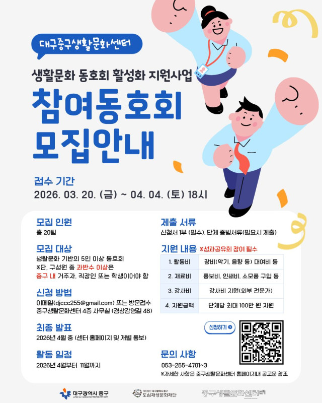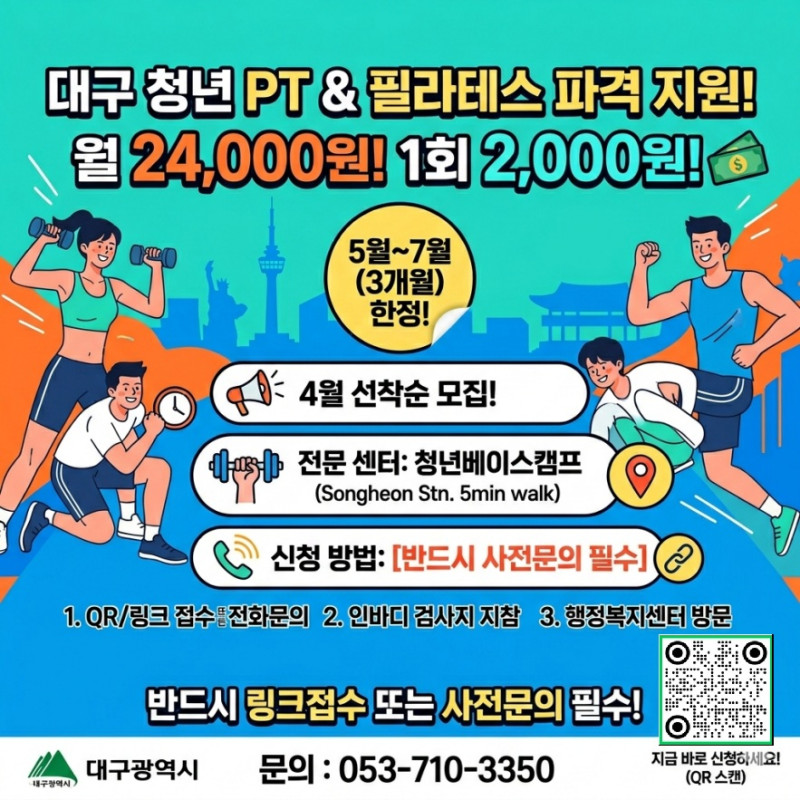 본문 메인 슬라이드 배너 이전 다음 청년들이 함께 상상하고 협업하여 더 높게 점프할 수 있는 열린 공간, 젊프로 점프하자! 더보기 + 청년을 위한 놓칠 수 없는 꿀정보 한가득 현재 모집 중 더보기+ 진행중 월24,000원 / 2026년 대구 청년신체건강증진서비스 이용자 사전모집 월성종합사회복지관(청년베이스캠프) 진행중 [원데이 클래스] 쿠키 베이킹 대구중구생활문화센터 진행중 [2026년 생활문화 동호회 활성화 지원사업] 참여 동호회 모집 안내 ※재공고 대구중구생활문화센터 진행중 대구중구가족센터 예비부모 프로그램 대구중구가족센터 진행중 내 손안의 청년정보 '오픈채팅방' 오픈 대구 진행중 🤖AI 협업 communication 실험 참가자 모집 고려대학교 진행중 「배운김에 남구」 참여자 추가모집 협동조합 소이랩 진행중 AI 기반 UXUI 설계 프로젝트 과정 사전 신청 OPEN🔥 인사이드아웃 트랜디한 감각으로 무장한 전문가 청년 프리랜서 소중한 순간을 기록합니다. 평점 0.0 400,000원 ~ 영화, 광고, 룩북, 홍보영상, 뮤직비디오, 행사 사진, 연출, 기획, 촬영, 편집 가능 평점 0.0 300,000원~ 대구 공연부터 축제, 행사 등 공연·문화예술 콘텐츠 기획이 필요하신가요?! 평점 0.0 0 퍼포먼스 힙합댄스팀 아이즈세션과 함께 공연도 기획하고! 댄스도 배워보세요! 평점 0.0 30,000원 사용자의 공간과 취향에 맞는 회화를 주문제작해드립니다. 평점 0.0 80,000원~ 빠르게 만들어드료요!! 생일선물이나 가볍게 기념일로딱!! 평점 0.0 2,000원 쉽고 재밌게 배우는 피아노 평점 0.0 30,000원 (강의) 굿즈디자인 / 굿즈제작 / 포토샵역량강화 평점 0.0 100,000원~ 상세내용보기 청년정책꿀팁 청년커뮤니티 청년공간 청년단체 청년상담소