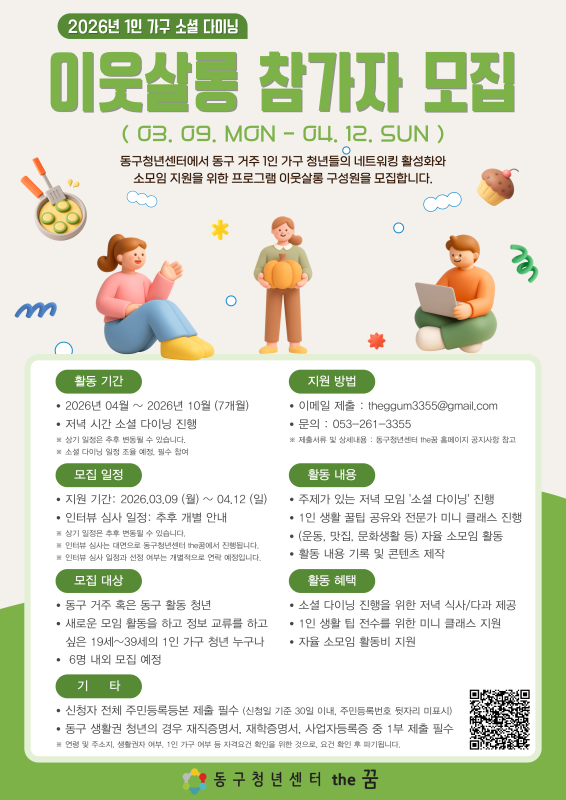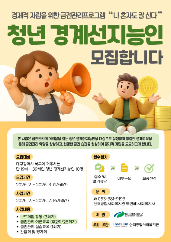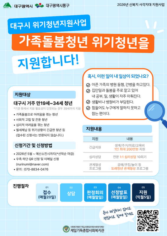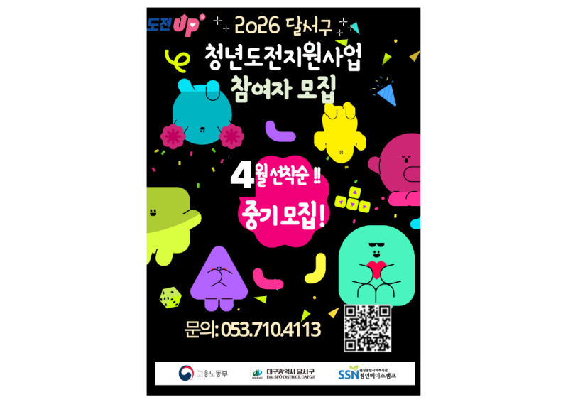 본문 메인 슬라이드 배너 이전 다음 청년들이 함께 상상하고 협업하여 더 높게 점프할 수 있는 열린 공간, 젊프로 점프하자! 더보기 + 청년을 위한 놓칠 수 없는 꿀정보 한가득 현재 모집 중 더보기+ 진행중 (모집중) 진로 설정반 모집!!! 자기이해부터 진로설정, 최신 채용 트렌드까지 나만의 진로 로드맵 완성하기 대구동구청년센터the꿈 진행중 2026 대구광역시 문학진흥시설 3기 안내원 모집 (사)대구작가콜로퀴엄 진행중 2026 모의면접실 [NCS 필기 전형] 특강 수성구청년센터 진행중 (모집중)2026 이웃살롱 모집 공고(~4.12) 대구동구청년센터the꿈 진행중 (모집중)2026 the꿈 기자단 모집 공고(~4.12) 대구동구청년센터the꿈 진행중 ★대구시 가족돌봄청년, 위기청년을 지원합니다★ 제일기독종합사회복지관 진행중 2026년 청년도전지원사업 중기 모집중!! 달서구청년도전지원사업본부 진행중 [중구청년지원센터] 중구 청년 문화 센터 4월 원데이클래스(아크릴페인팅) 중구청년지원센터 트랜디한 감각으로 무장한 전문가 청년 프리랜서 미술작가로 활동 중입니다 평점 0.0 50000원 ~ #극영화 #다큐멘터리 평점 0.0 협의 연주 평점 0.0 300,000~600,000원 강점을 이해하고 커리어 현장에서 활용할 수 있도록 도와드려요. 평점 0.0 50,000원 ~ 나도 모르는 내 마음이 궁금하지 않아? 지금 바로 심리검사 받고 나를 더 깊이 알아보자! 평점 0.0 80,000원~ 로맨스판타지풍의 원화 평점 0.0 60,000원~ 깔끔하고 정석적인 디자인을 해드립니다 평점 0.0 150,000원 간단한 로고를 제작합니다. 평점 0.0 150,000 상세내용보기 청년정책꿀팁 청년커뮤니티 청년공간 청년단체 청년상담소