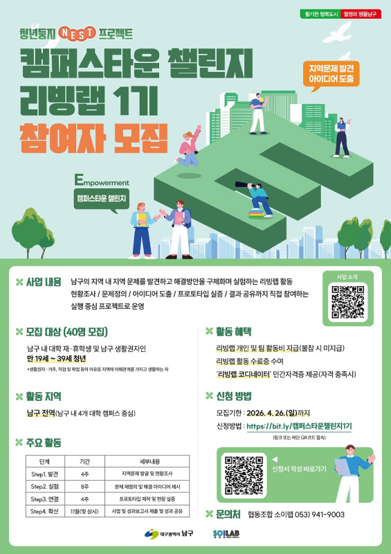 본문 메인 슬라이드 배너 이전 다음 청년들이 함께 상상하고 협업하여 더 높게 점프할 수 있는 열린 공간, 젊프로 점프하자! 더보기 + 청년을 위한 놓칠 수 없는 꿀정보 한가득 현재 모집 중 더보기+ 진행중 [청년으로] 청년예산원정대 모집! 사단법인 청년으로 진행중 마케팅 기획 및 문화기획 채용공고 주식회사 띵띵연구소 진행중 [남구청년센터] 봉덕극장 4月 상영예매란 남구청년센터 진행중 내 손안의 청년정보 '오픈채팅방' 오픈 대구 진행중 [인사이드아웃] 샘파트너스 생성형 AI 활용 크리에이티브 프로젝트 과정 모집 (~4/26) 인사이드아웃 진행중 [인사이드아웃] 산리오 IP 활용 모바일 서비스 디자인 프로젝트 과정 모집 (~4/26) 인사이드아웃 진행중 <무료공간대여> 3인이상 어떤 모임이든 공간을 무료로 지원하는 프로모션에 참여하세요! 대구 북구도시재생지원센터 진행중 청년둥지 NEST 프로젝트/캠퍼스타운 챌린지 리빙랩 1기 참여자 모집 협동조합 소이랩 트랜디한 감각으로 무장한 전문가 청년 프리랜서 사업보고서, 교재등 사용자에게 맞춰진 디자인해 드립니다 평점 0.0 180,000원~ 공연영상, 홍보영상, 드론촬영, 행사스케치, 웨딩 등 각종 영상물 평점 0.0 300,000원 고객님과의 상담을 통해 맞춤 디저트제작 및 클래스를 안내해드립니다. 평점 0.0 18,000원 사진 촬영 및 편집, 디자인, 포토샵, 포스터 제작 평점 0.0 50,000원~200,000원 모델링관련외주와 모션그래픽외주를 받습니다. 평점 0.0 100,000원~ 신나고 즐겁게 노래해요 평점 0.0 50,000 클래식 피아노 연주, 반주, 개인레슨 편하게 문의주세요 ◡̈ 평점 0.0 50,000원~150,000원 나만의 책 만들기 평점 0.0 300,000원. 분량이나 조건 따라 달라질 수 있음. 인쇄비 별도. 상세내용보기 청년정책꿀팁 청년커뮤니티 청년공간 청년단체 청년상담소
