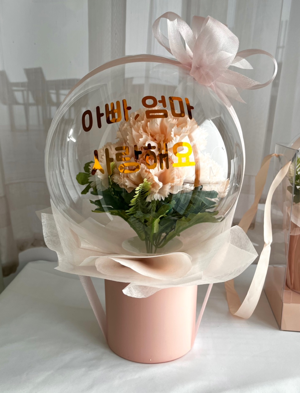 시들지 않는 실크플라워(조화)를 활용해 꽃풍선이 제작됩니다. 퀄리티가 높고 아름다운 구성으로 커스터마이징 레터링을 추가해 선물할 수 있습니다.