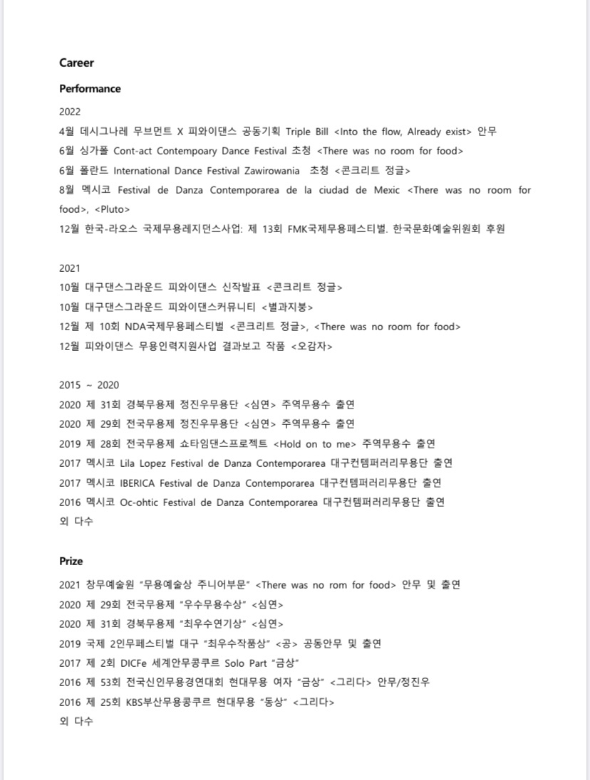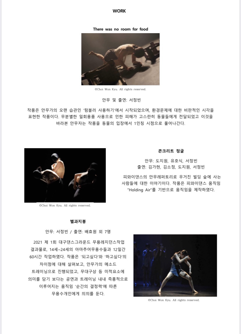 - 무용 프로젝트? 아티스트간의 협력으로 이루어지는 무용작품 및 콜라보작업.