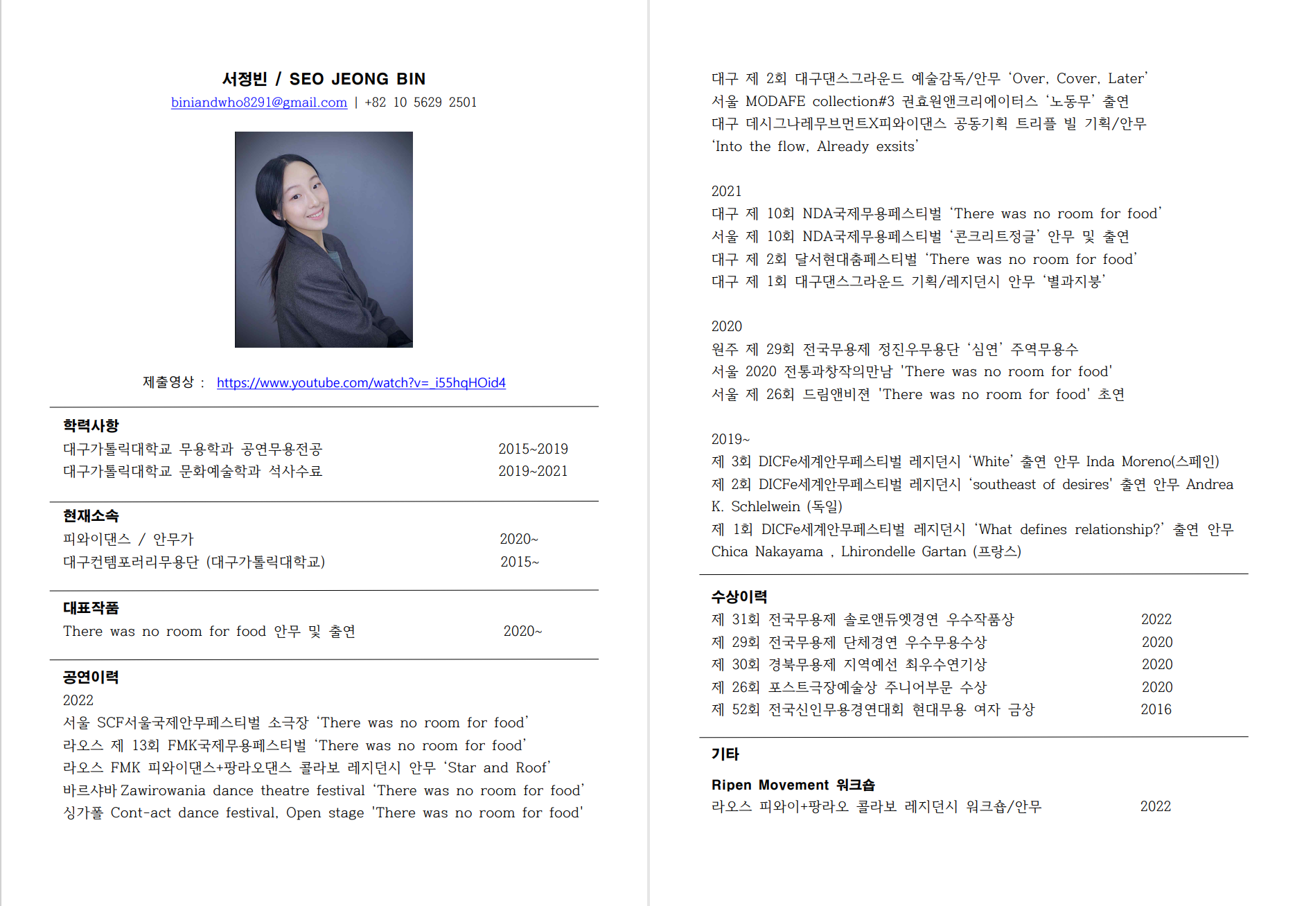 * 무용레지던스안무작업 1. 연습시간 / 안무비 / 기획의도 등은 별도의 협의 후 가능 |