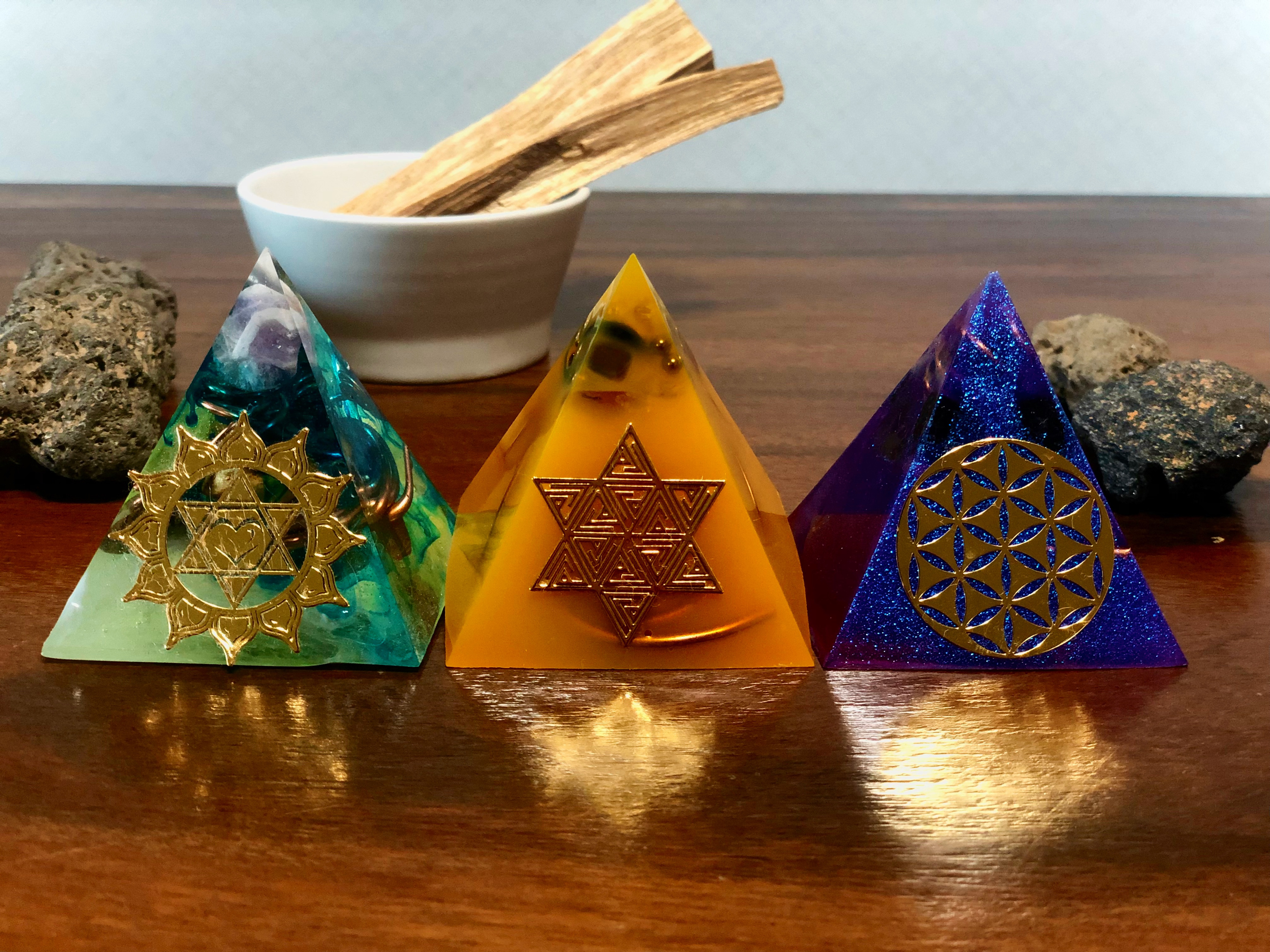 오르고나이트는 크리스탈 원석, 신성한 문양, 자연 재료 조합을 통해