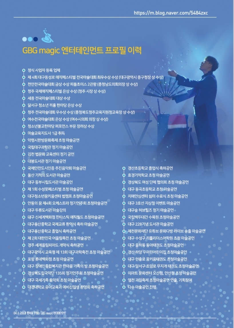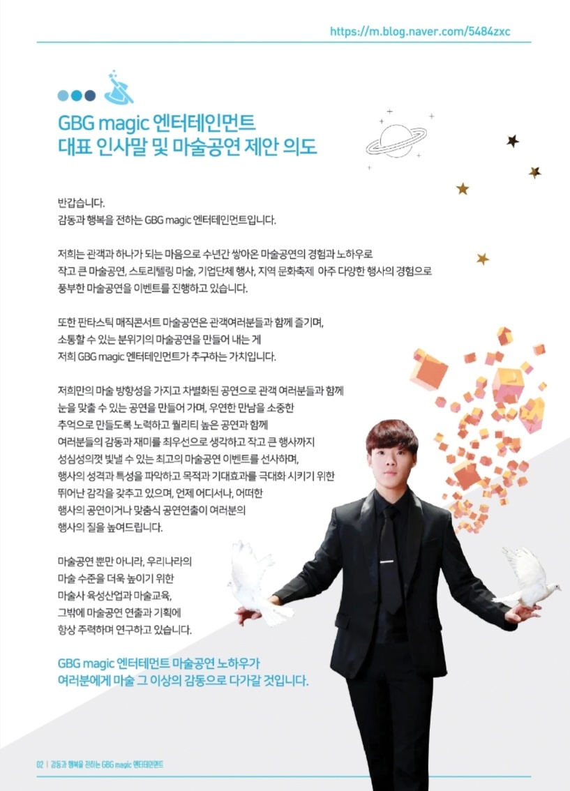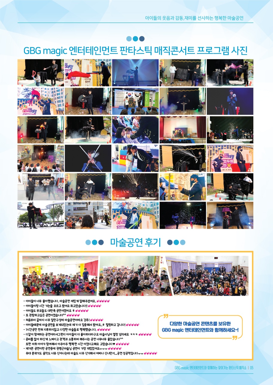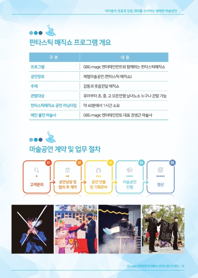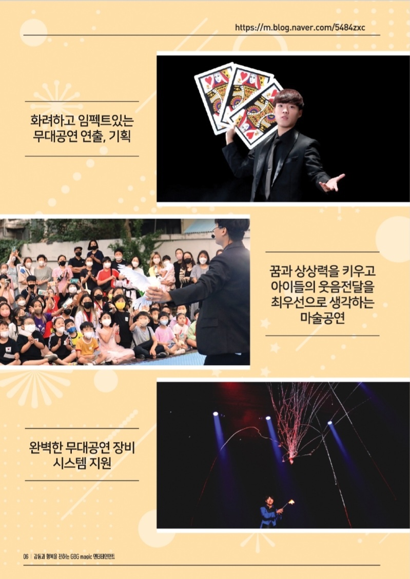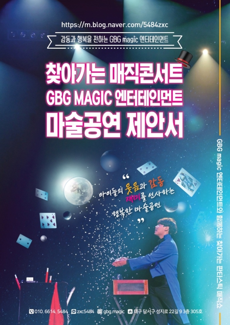 반갑습니다 감동과 행복을 전하는 GBG magic 엔터테인먼트입니다 저희는 관객과 하나가 되는 마음으로 수년간 쌓아온 마술공연의 경험과 노하우로 작고 큰 마술공연, 스토리텔링 마술, 기업단체 행사, 지역 문화축제 아주 다양한 행사의 경험으로 풍부한 마술공연을 진행하고 있습니다 우연한 만남을 소중한 추억으로 만들도록 노력하고 퀄리티 높은 공연과 함께 여러분들의 감동과 재미를 최우선으로 생각하고 작고 큰 행사까지 성심성의껏 빛낼 수 있는 최고의 마술공연 이벤트를 선사해드리겠습니다