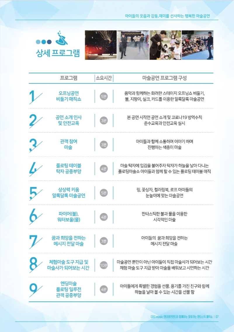 1회 700,000 (협의가능) 프로그램 GBG magic 엔터테인먼트와 함께하는 판타스틱매직쇼 공연장르 체험마술공연 (판타스틱 매직쇼) 주제 감동과 웃음전달 매직쇼 관람대상 유아부터 초, 중, 고 모든연령 남녀노소 누구나 관람 가능 판타스틱매직쇼 약 40분에서 1시간 소요 공연 러닝타임 |