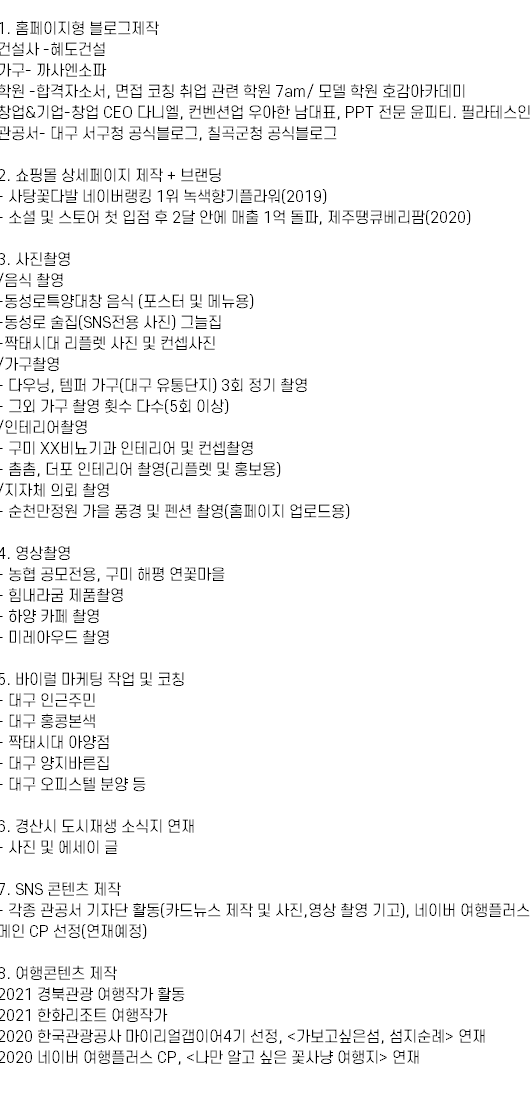 홈페이지형 블로그 제작 및 체험단 마케팅, 홍보 관련 촬영 작업 등