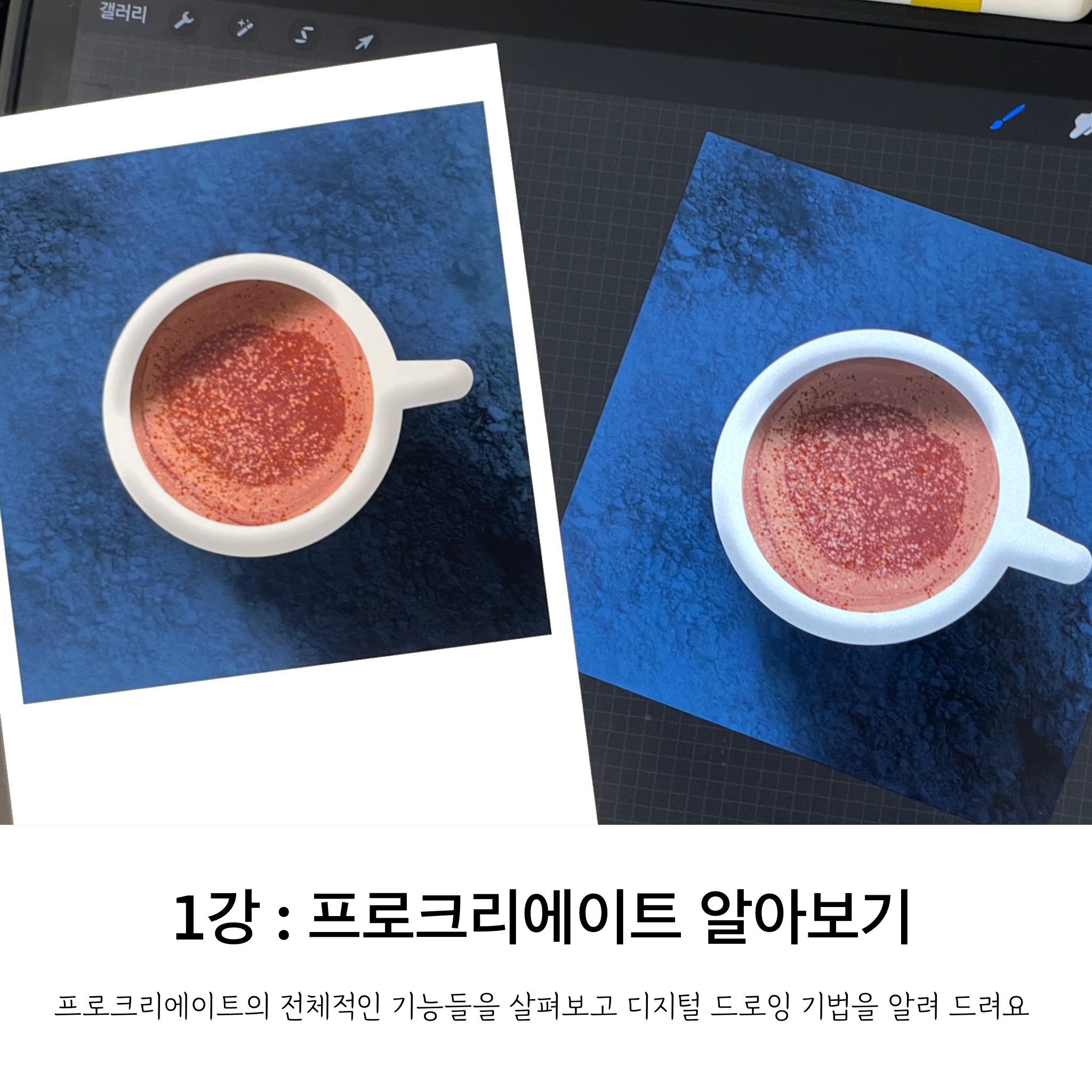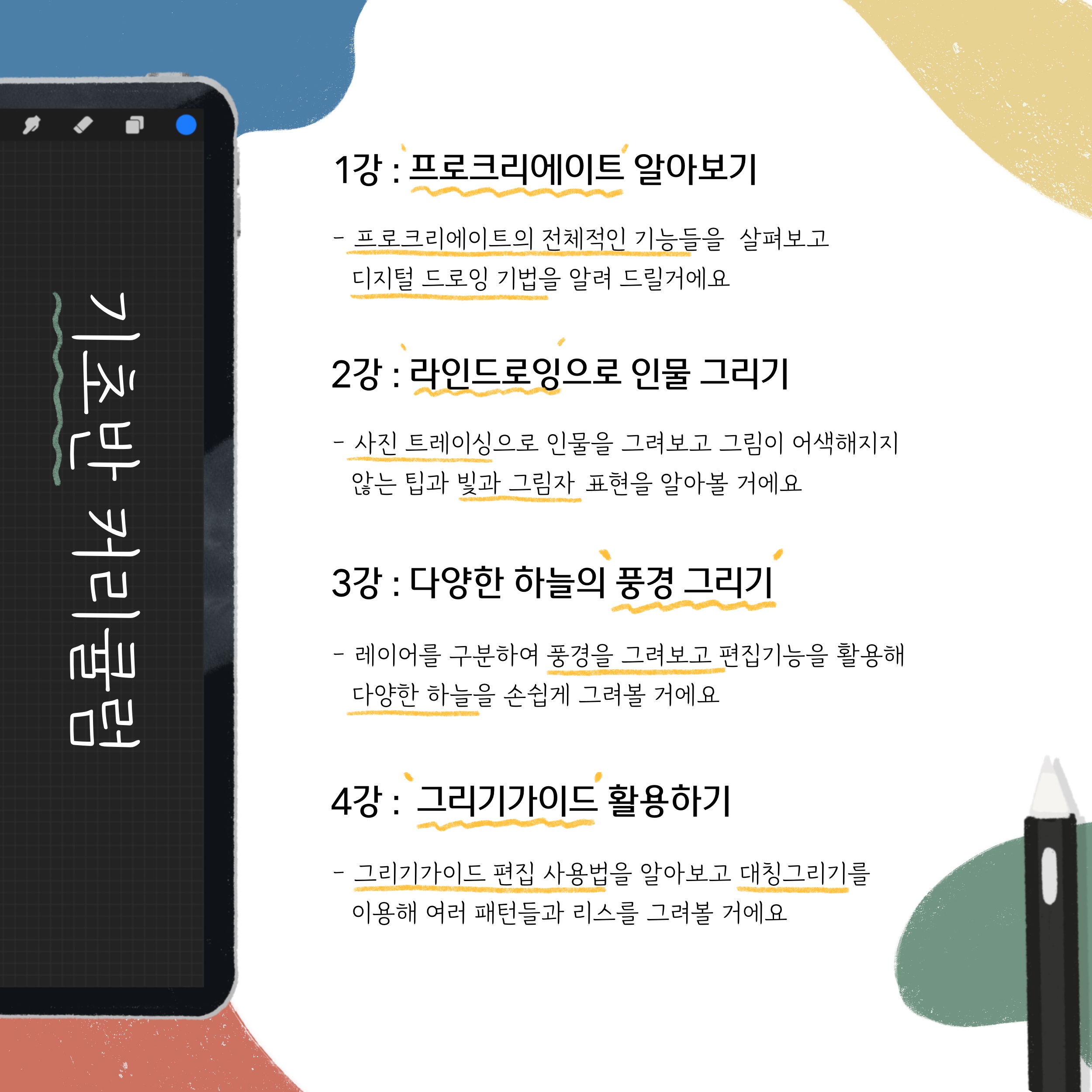아이패드 드로잉 기초반은 프로크리에이트 앱의 기능들을 하나씩 알아보고 그림에 적용해보는 것을 목표로 커리큘럼을 구성했어요. 그림을 배우지 않으셨던 분들도, 아이패드가 처음이신 분들도 참여가능한 수업입니다?
