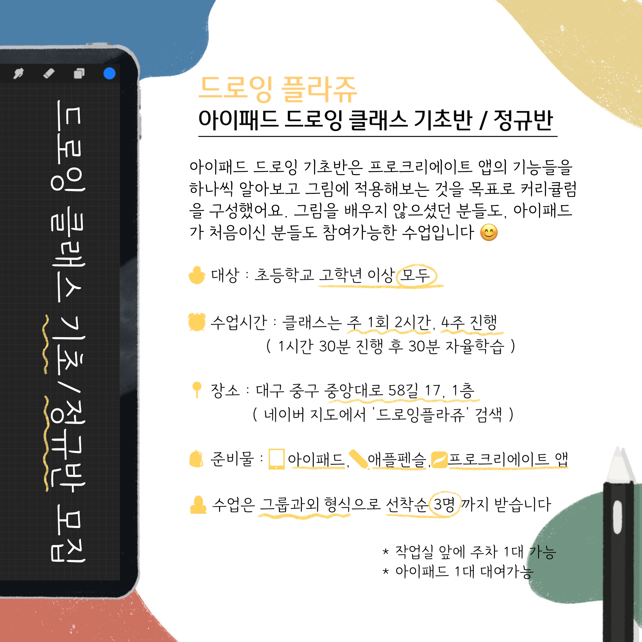아이패드 드로잉 클래스 기초반 : 12만원 정규반 : 10만원 |