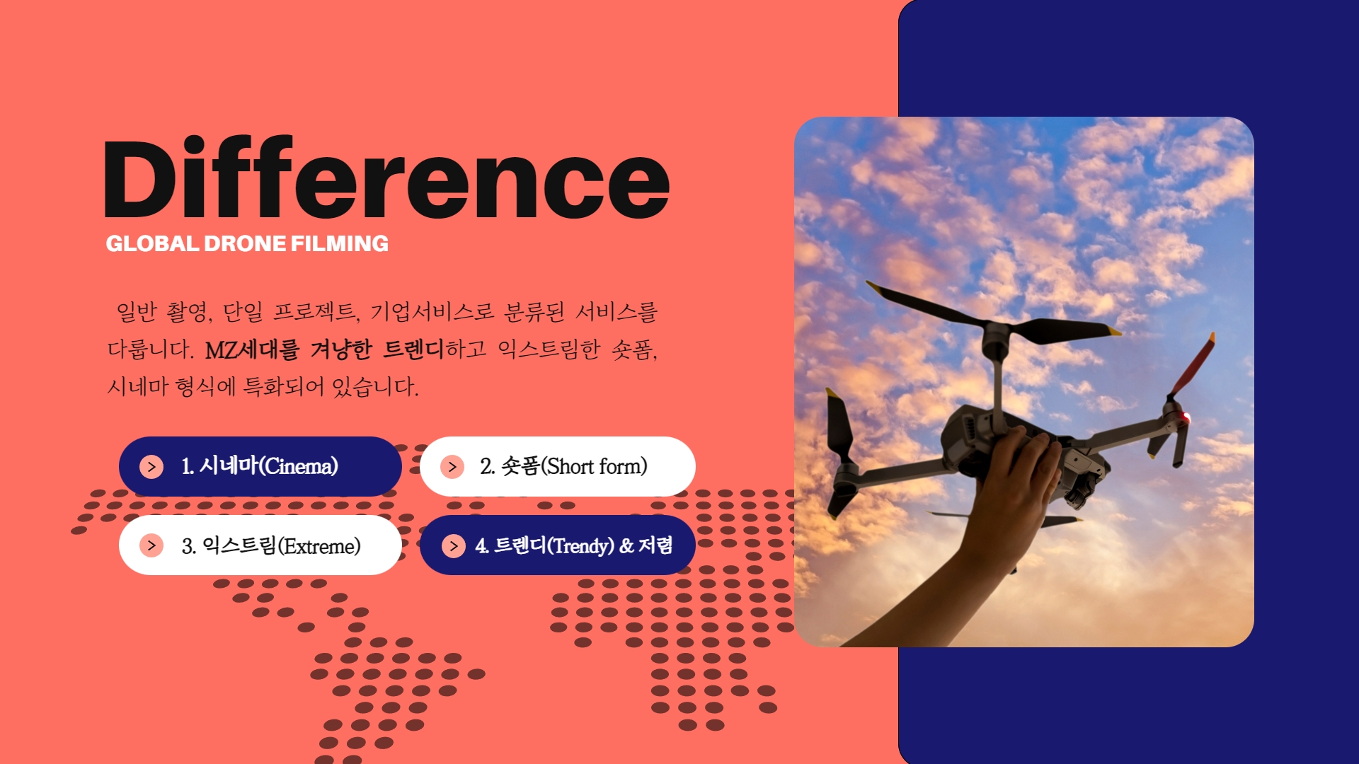 드론의 각 특성의 따라 관광지, 영화 , 드라마, CF촬영, 웨딩, 기업 홍보, 유튜브 촬영, 다양한 행사, 해외촬영, 학교 및 교회나 관공서 홍보 등을 촬영하여 영상 편집 제작까지 작업 합니다.