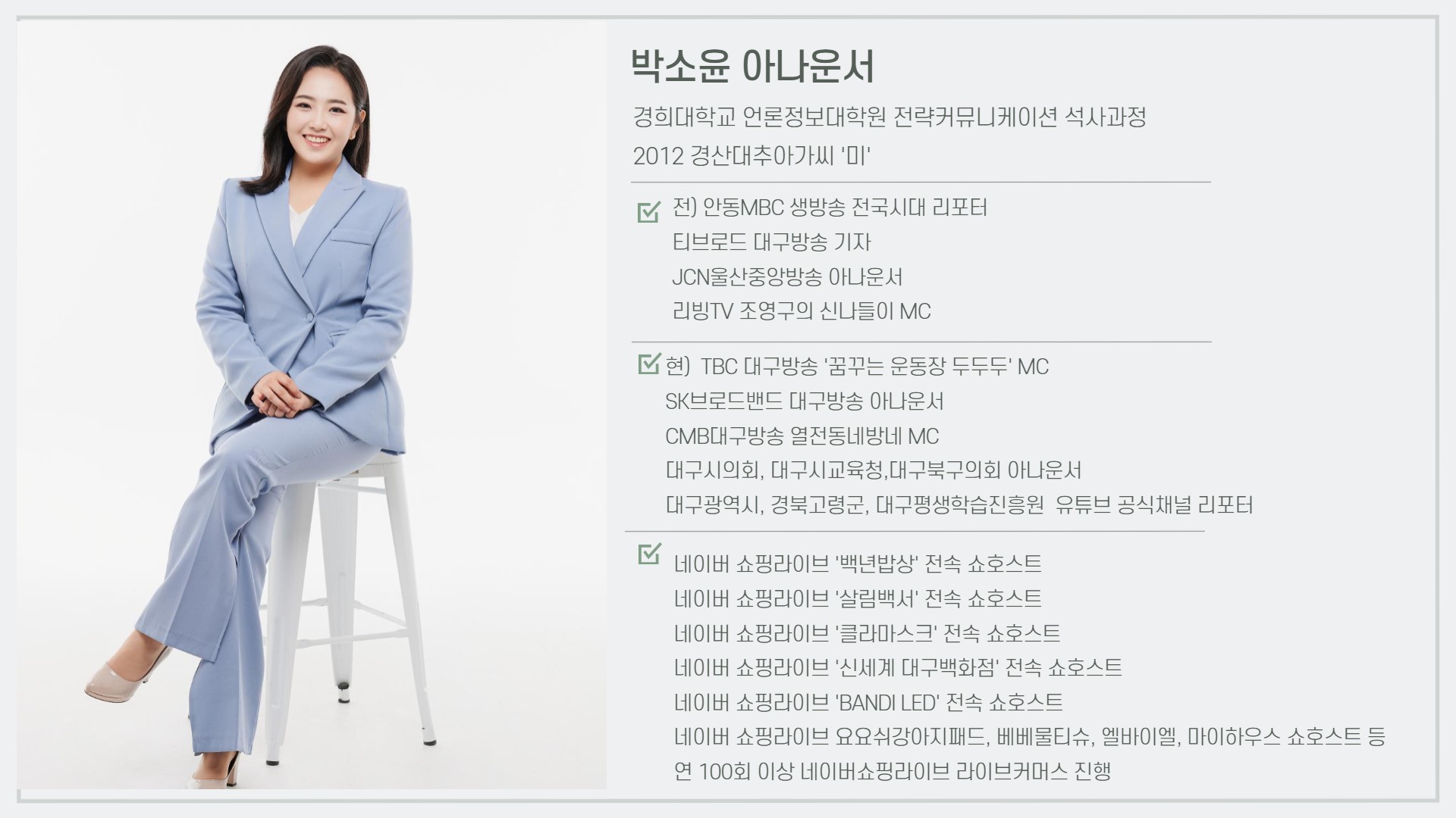 안녕하세요? 말로 행복을 전하는 아나운서 박소윤입니다.