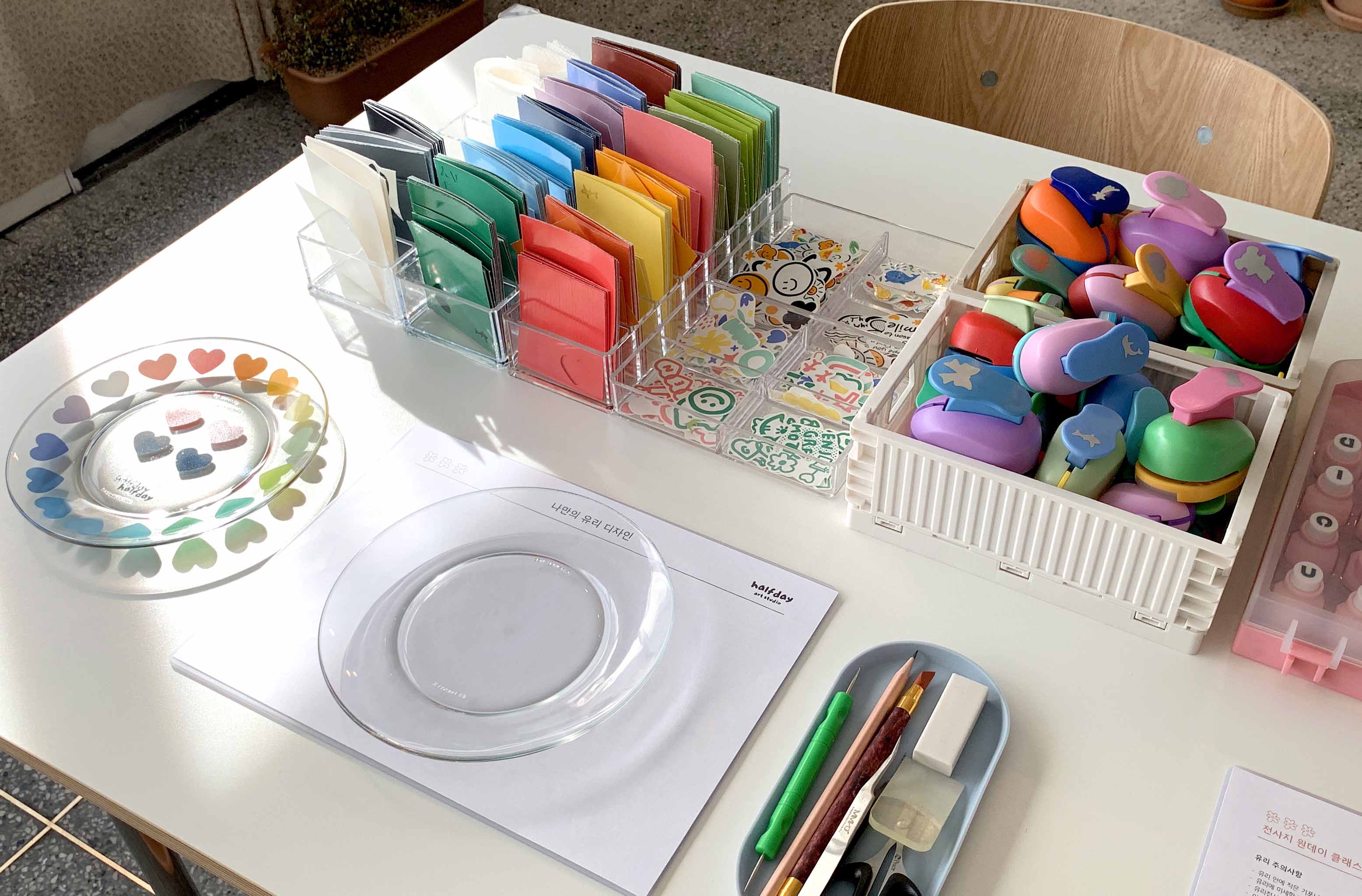 알록달록한 색전사지와 하프데이에서 자체제작한 귀여운 그림전사지, 모양 펀칭기 등이 준비되어 있어