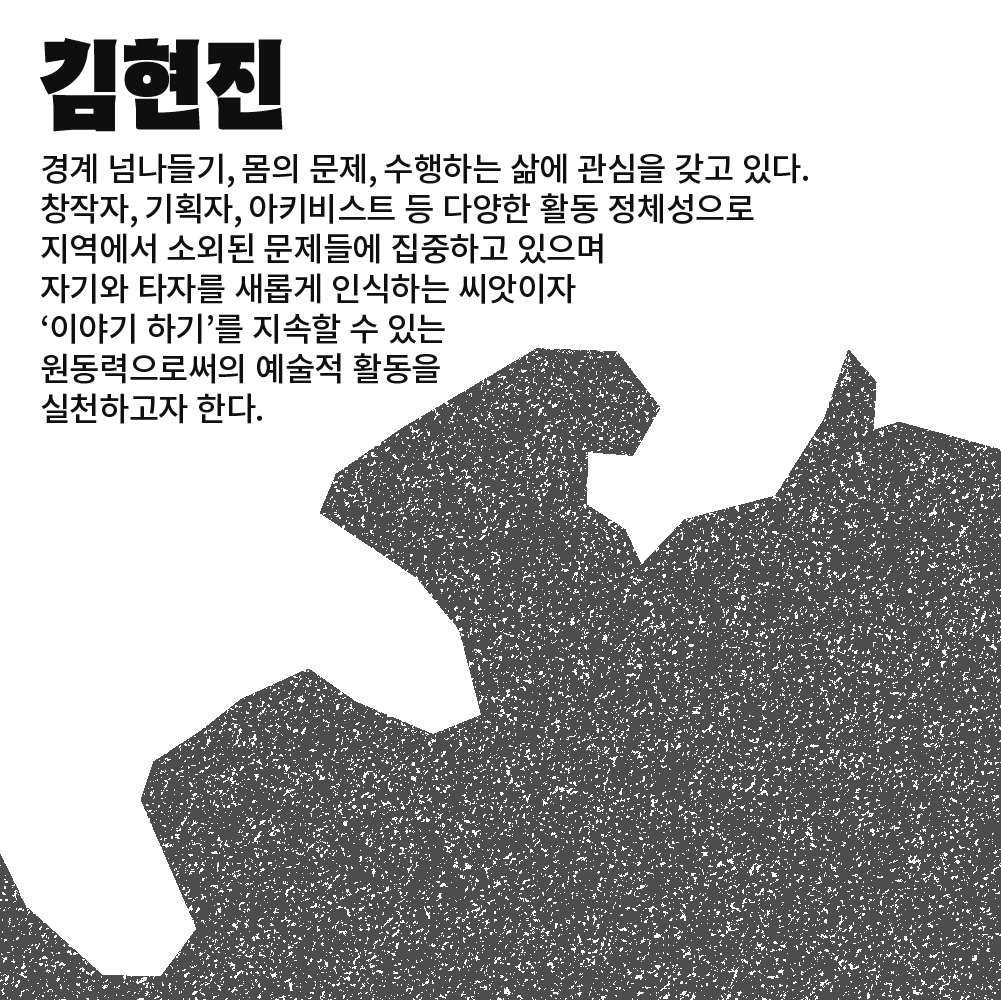 2016년부터 시각예술을 기반으로 한 창작 및 기획 활동을 통해 사람들과 만나고 있습니다. 시각적 이미지와 글, 디자인을 함께 다루며 전시, 축제, 교육, 아카이브 등 다양한 형태의 예술 활동을 주도적으로 실험하거나 협업의 일원으로써 진행해왔습니다. 예술이 우리의 삶을 조금 다르게 바라보고 중요한 것을 잃어버리지 않게 해준다고 믿으며, 도시와 사람, 장르 간 말걸기를 시도하고 있습니다.