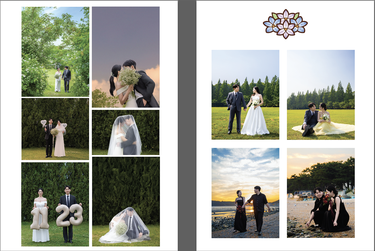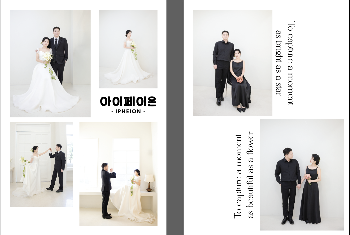 사진 + 프리웨딩영상 별 패키지(스튜디오 촬영) : 250,000원 - 촬영 소요 시간 : 1시간 30분-3시간 - 셀렉 장수 20장까지 꽃 패키지(야외웨딩스냅) : 350,000원 - 촬영 소요 시간 : 2 - 3 시간 - 셀렉 장수 : 50장까지 별꽃 패키지 (스튜디오 촬영 + 야외웨딩스냅) : 450,000원 - 촬영 소요 시간 : 하루종일 또는 2번(이틀) 나뉘어서 촬영 - 셀렉 장수 : 50장까지 |
