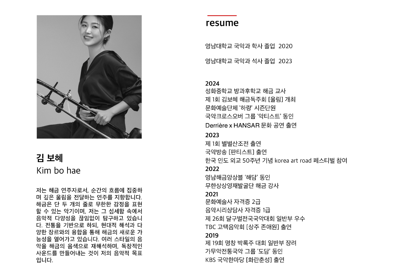해금 전공 석사 졸업 연주자로, 국내외 다양한 무대 경험을 바탕으로 깊이 있는 국악·해금 공연을 선보입니다.