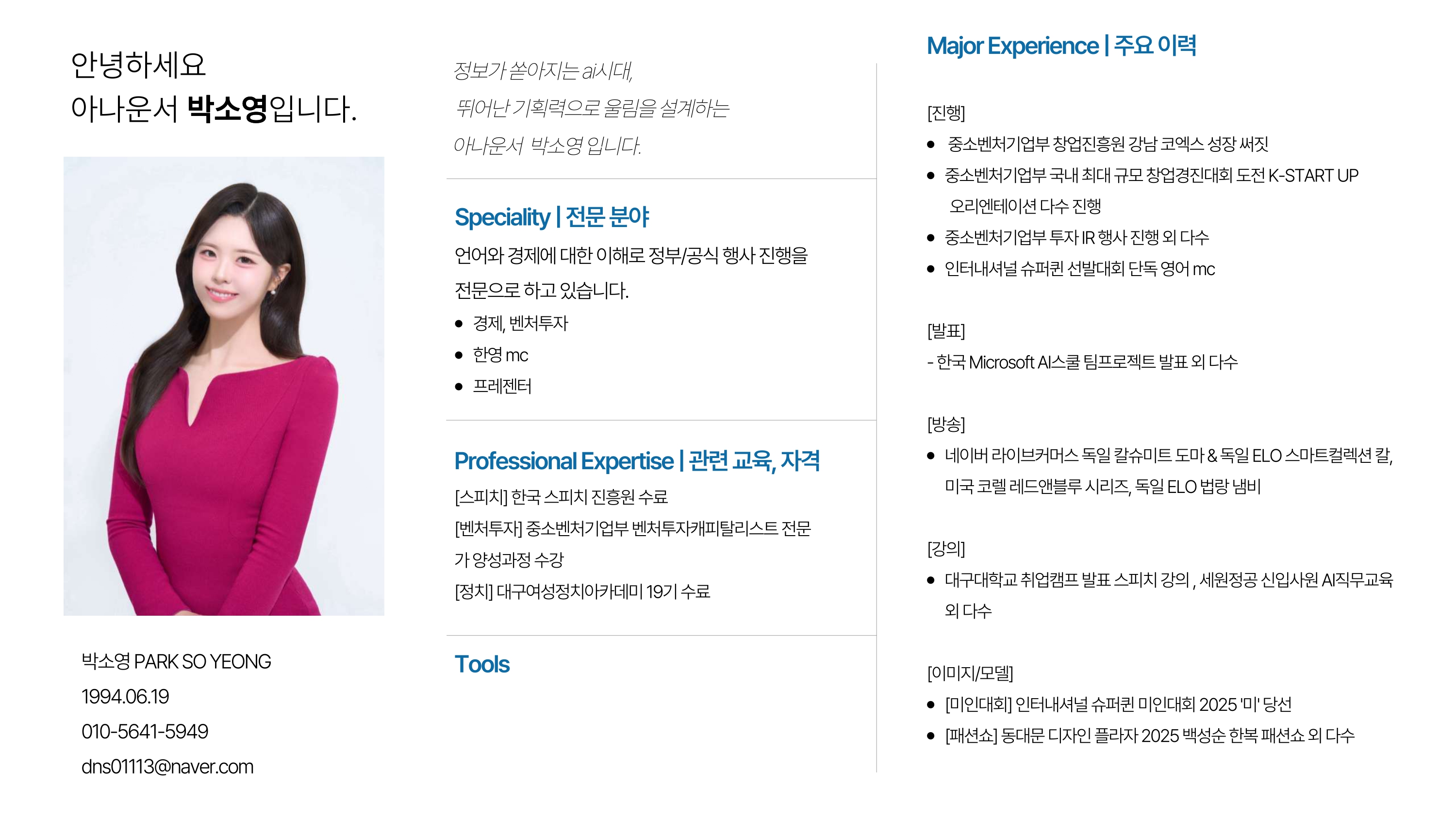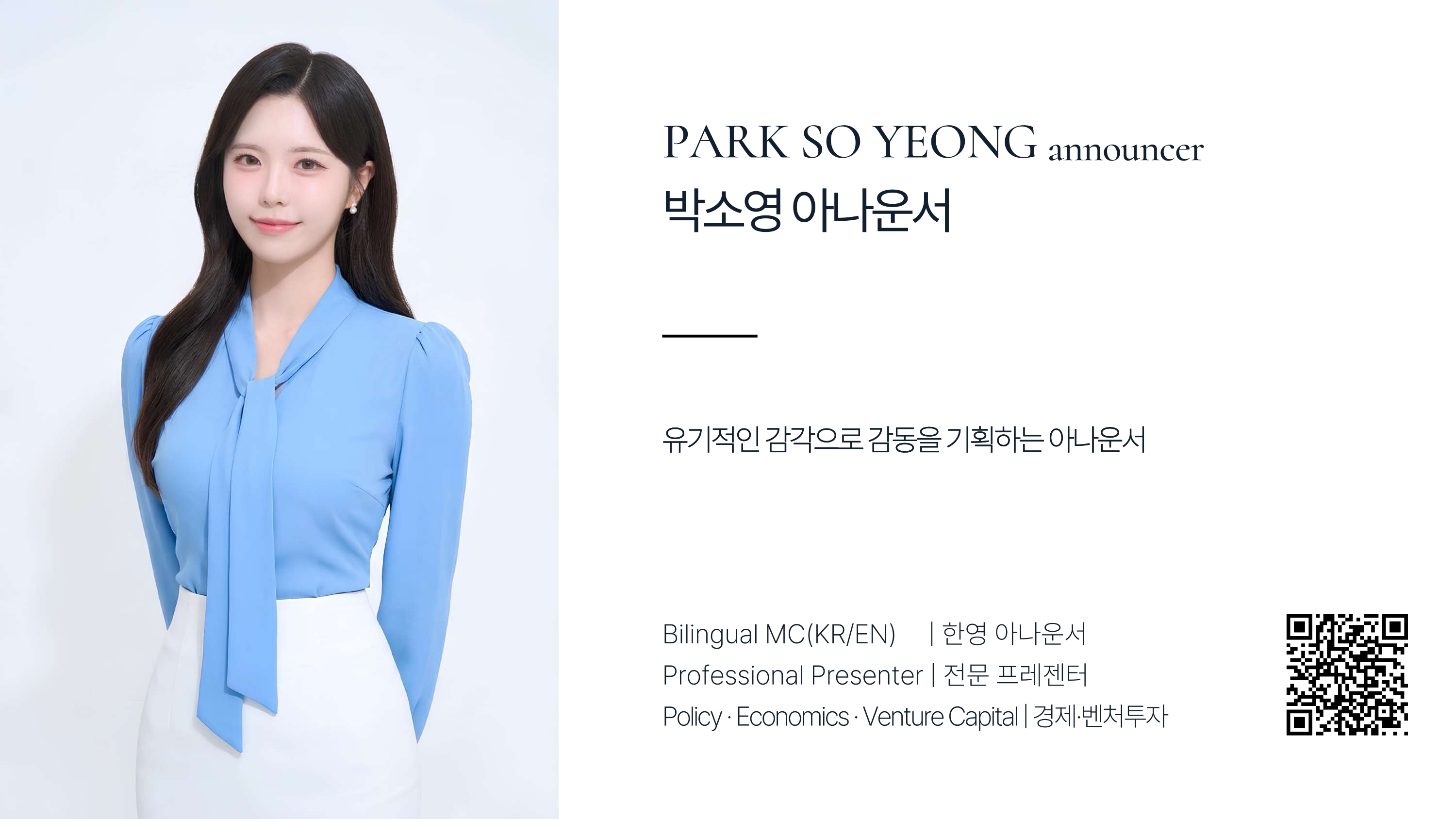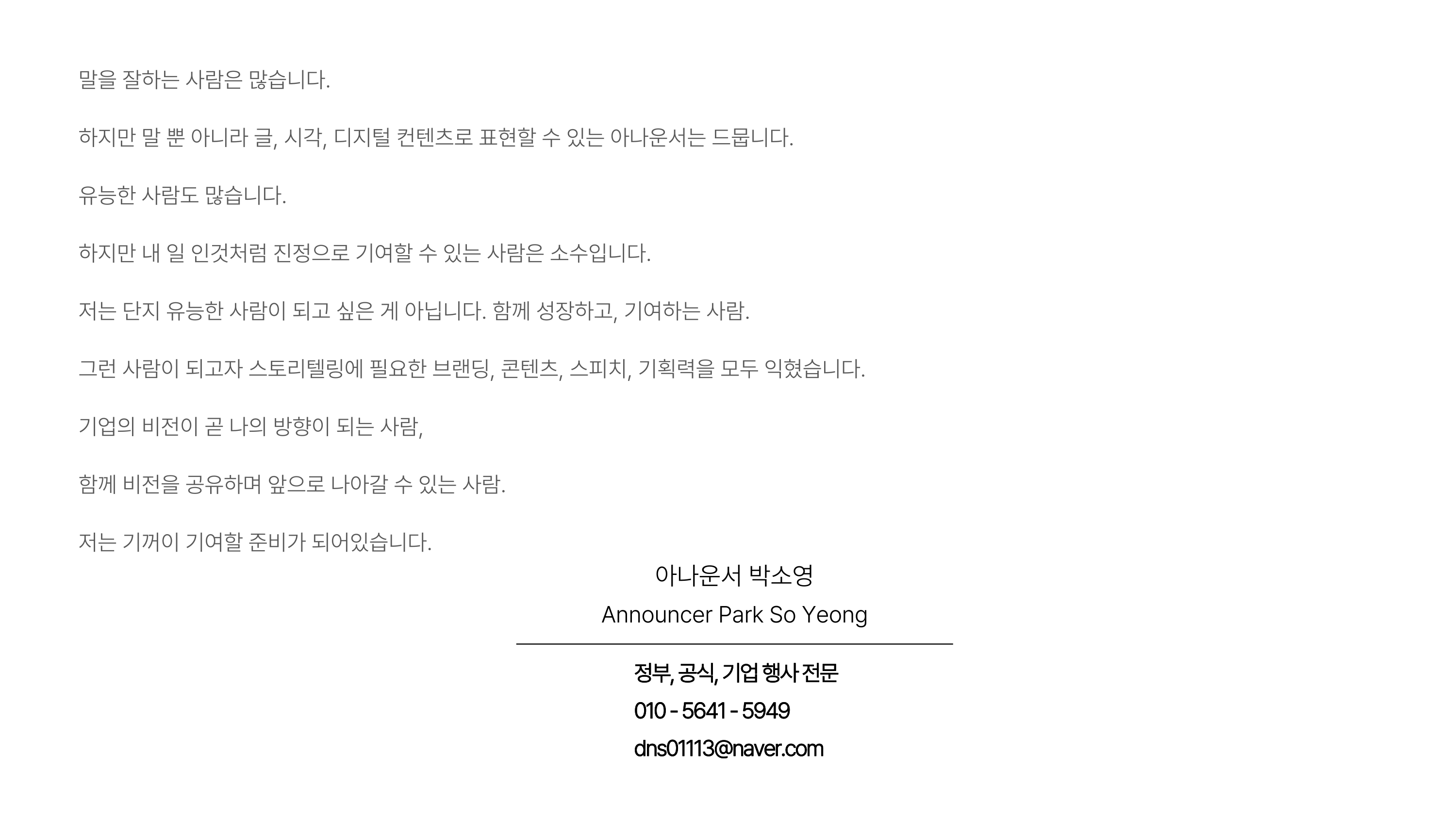 안녕하세요, 단순히 대본을 읽는 것을 넘어 무대의 흐름을 유기적으로 기획하고 감동을 설계하는 아나운서 박소영입니다.