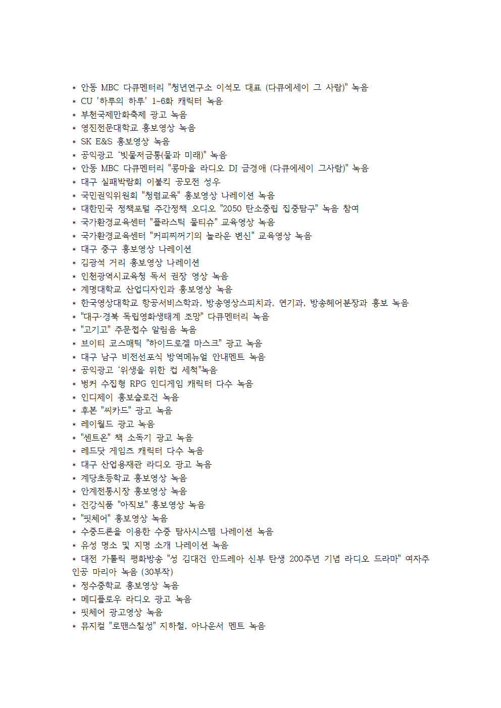 * 싱크를 맞추며 해야하는 TV광고, 유튜브 광고 등의 녹음 * 애니메이션 / 게임 등 캐릭터 연기가 포함된 녹음 60,000 (반 장 기준) + @ (글자 12P, 간격 160%, 한 문장 당 엔터 한 번씩 들어갑니다) |