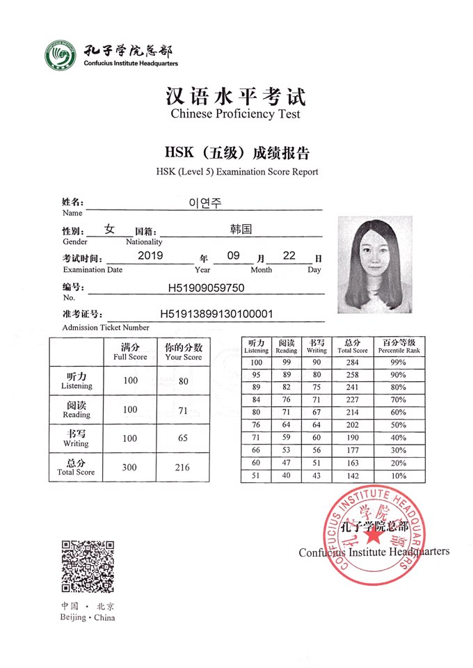 - 新HSK5급(2022.03.19 취득) 240점