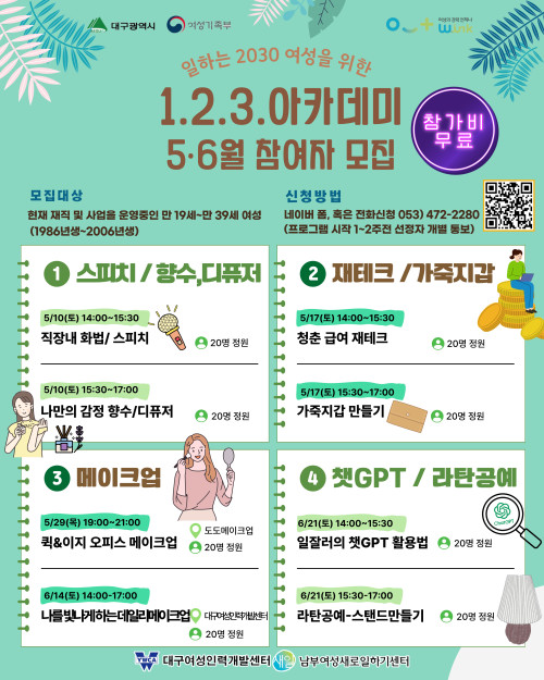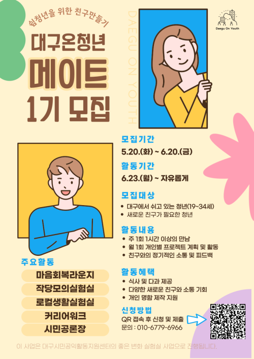 현재 모집 중 검색폼 대구광역시는 해당 페이지를 정보제공을 위한 목적으로 플랫폼을 운영하며, 각 게시글의 내용 및 운영방침에 대한 책임을 지지 않습니다. 대구광역시청년센터 사업 모아보기 전체보기 분야 : 전체 지원사업 채용/인턴/알바 기자단/서포터즈/자원봉사 공모전 교육/강연/토론 축제/공연/전시 커뮤니티활동 기타 정렬 : 전체 신규등록순 모집마감순 상태 : 전체 진행중 종료 기간 설정 검색 검색어 입력 꿀정보등록 누구나 쉽고 빠르게 청년정보를 등록하여 홍보할 수 있습니다. 전체선택 종료 청년 퍼스널 브랜딩 프로젝트 《스타일-남 시즌1》 참가자 모집 대구남구청년센터 ~ 2025.06.20 종료 Boost Your Local - 지역 청년 지원사업: 5기 지원단체 모집 (사)함께만드는세상 ~ 2025.06.20 종료 [조인어스코리아] 2025 하반기 JOINTERNSHIP 29기 모집 (~6/20) 조인어스코리아 ~ 2025.06.20 종료 2025 채식문화활성화포럼 사단법인대자연사랑실천본부 ~ 2025.06.20 종료 [대구온청년] 청년메이트 1기 모집 대구온청년 ~ 2025.06.20 종료 [대구남부새일센터-무료] 청년여성 특화프로그램 1.2.3. 아카데미 5.6월 신청 대구여성인력개발센터 남부여성새로일하기센터 ~ 2025.06.20 종료 2025년 청년도전지원사업 단기 모집중!! 달서구청년도전지원사업본부 ~ 2025.06.19 종료 안양청년1번가 개소식 기념 꽃바구니 원데이클래스 모집 안양청년1번가 ~ 2025.06.19 171 172 173 174 175 176 177 178 179 180