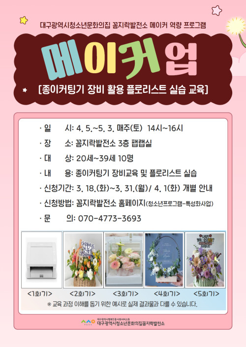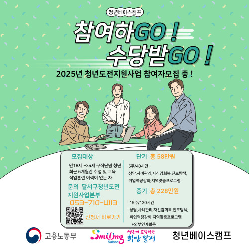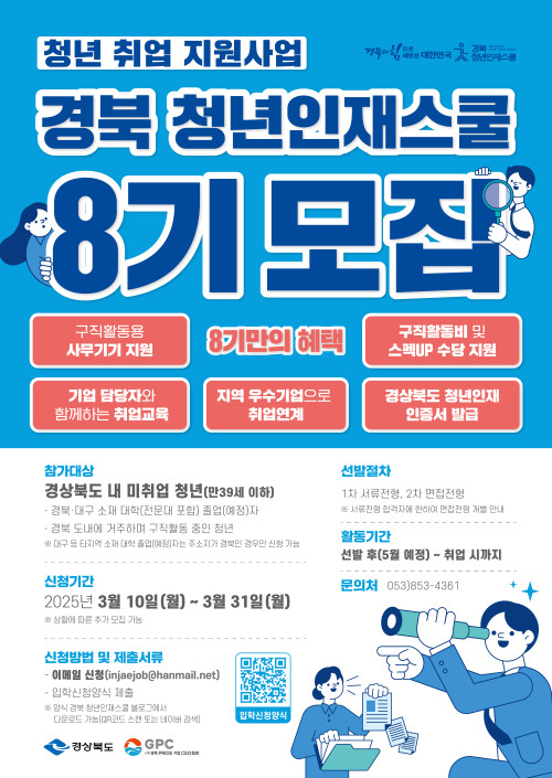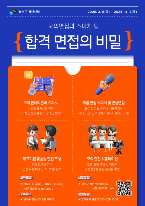 현재 모집 중 검색폼 대구광역시는 해당 페이지를 정보제공을 위한 목적으로 플랫폼을 운영하며, 각 게시글의 내용 및 운영방침에 대한 책임을 지지 않습니다. 대구광역시청년센터 사업 모아보기 전체보기 분야 : 전체 지원사업 채용/인턴/알바 기자단/서포터즈/자원봉사 공모전 교육/강연/토론 축제/공연/전시 커뮤니티활동 기타 정렬 : 전체 신규등록순 모집마감순 상태 : 전체 진행중 종료 기간 설정 검색 검색어 입력 꿀정보등록 누구나 쉽고 빠르게 청년정보를 등록하여 홍보할 수 있습니다. 전체선택 종료 합격 면접의 비밀: 모의면접과 스피치 팁 달서구 청년센터 ~ 2025.04.03 종료 구글과 함께 공부하는 기술 워크샵! GDG Daegu ~ 2025.04.02 종료 2025 남구 청년도전지원사업 참여자 모집 남구청년센터 ~ 2025.04.01 종료 2025년 청년도전지원사업 단기,중기 모집중!! 달서구청년도전지원사업본부 ~ 2025.03.31 종료 기본소득대구네트워크x책빵고스란히 독서모임 “피난처에서 만나요” 시즌4 기본소득대구네트워크x책빵고스란히 ~ 2025.03.31 종료 [꼼지락발전소] 메이커 역량강화 프로그램 '메이커업' 대구광역시청소년문화의집 꼼지락발전소 ~ 2025.03.31 종료 2025년 청년농산업(예비) 창업자 모집(추가) 경북대학교 농산업창업지원센터 ~ 2025.03.31 종료 경북 청년인재스쿨 8기 모집! (사)경북 PRIDE기업 CEO협회 ~ 2025.03.31 211 212 213 214 215 216 217 218 219 220