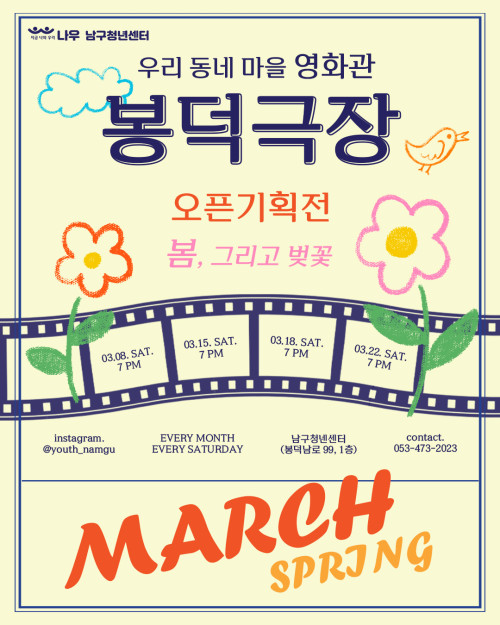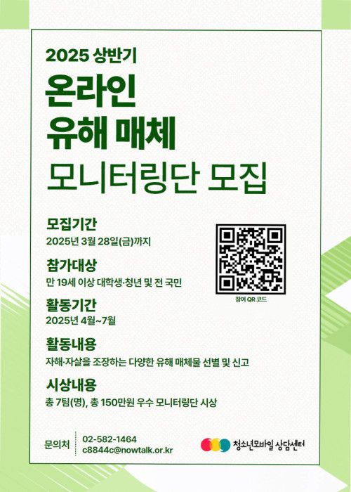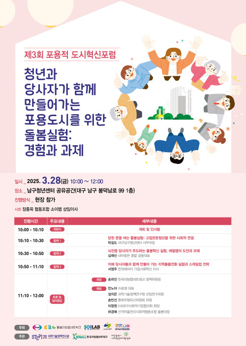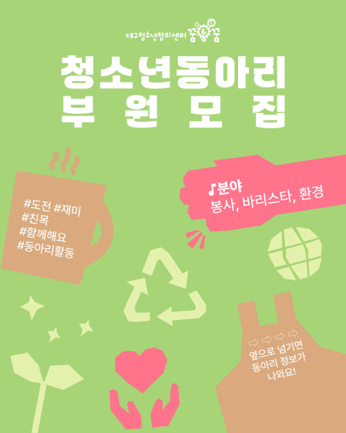 현재 모집 중 검색폼 대구광역시는 해당 페이지를 정보제공을 위한 목적으로 플랫폼을 운영하며, 각 게시글의 내용 및 운영방침에 대한 책임을 지지 않습니다. 대구광역시청년센터 사업 모아보기 전체보기 분야 : 전체 지원사업 채용/인턴/알바 기자단/서포터즈/자원봉사 공모전 교육/강연/토론 축제/공연/전시 커뮤니티활동 기타 정렬 : 전체 신규등록순 모집마감순 상태 : 전체 진행중 종료 기간 설정 검색 검색어 입력 꿀정보등록 누구나 쉽고 빠르게 청년정보를 등록하여 홍보할 수 있습니다. 전체선택 대구광역시청년센터 종료 「2025 iM 청춘 FESTA」여러분을 초대합니다. 대구광역시청년센터 ~ 2025.03.29 종료 봉덕극장 3月 상영예매란 남구청년센터 ~ 2025.03.29 종료 2025년 청소년 유해매체 차단 사업 시행 청소년모바일상담센터 ~ 2025.03.28 종료 Global AI Bootcamp 2025 - Daegu 맞다AI가 ~ 2025.03.28 대구광역시청년센터 종료 [2025 대구청년정책네트워크] 참여청년 모집공고 대구광역시청년센터 ~ 2025.03.28 종료 [대구청소년창의센터 꿈&꿈] 동아리 부원 모집(봉사, 바리스타, 환경) 대구청소년창의센터 ~ 2025.03.28 대구광역시청년센터 종료 2025 청년성장프로젝트 청년카페'취트키'언박싱 <사업설명회> 참여자 모집 대구광역시청년센터 ~ 2025.03.27 종료 <제3회 포용적 도시혁신포럼> 청년과 당사자가 함께 만들어가는 포용도시를 위한 돌봄실험 : 경험과 과제 협동조합 소이랩 ~ 2025.03.27 211 212 213 214 215 216 217 218 219 220