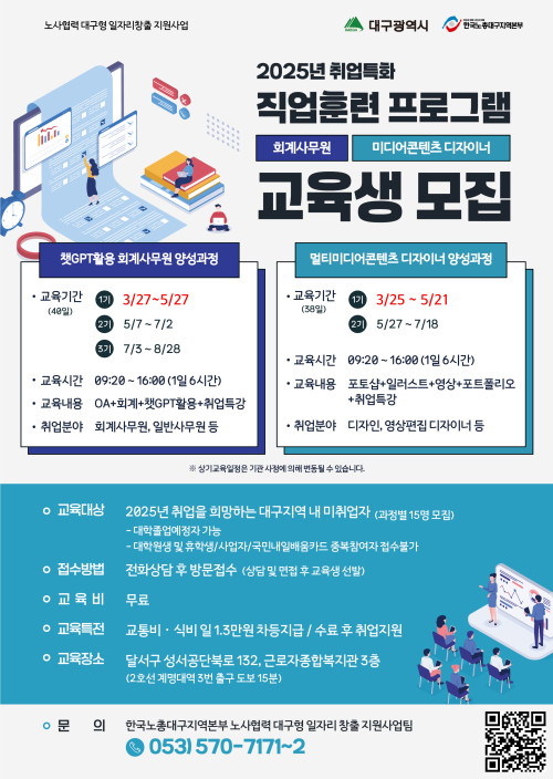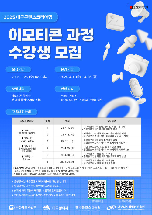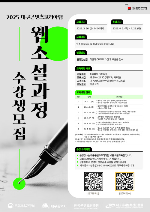 현재 모집 중 검색폼 대구광역시는 해당 페이지를 정보제공을 위한 목적으로 플랫폼을 운영하며, 각 게시글의 내용 및 운영방침에 대한 책임을 지지 않습니다. 대구광역시청년센터 사업 모아보기 전체보기 분야 : 전체 지원사업 채용/인턴/알바 기자단/서포터즈/자원봉사 공모전 교육/강연/토론 축제/공연/전시 커뮤니티활동 기타 정렬 : 전체 신규등록순 모집마감순 상태 : 전체 진행중 종료 기간 설정 검색 검색어 입력 꿀정보등록 누구나 쉽고 빠르게 청년정보를 등록하여 홍보할 수 있습니다. 전체선택 종료 [2025년 제1차 미래플랜아카데미 행사에 여러분을 초대합니다!(초청강사 : 김광석 교수)] 대구 서구청 ~ 2025.03.27 종료 3월 청년마음상담소 with 수성구정신건강복지센터 수성구청년센터 ~ 2025.03.26 종료 2025년 대구콘텐츠코리아랩 크리에이터 아카데미 인스타툰 과정 참가자 모집 (재)대구디지털혁신진흥원 ~ 2025.03.26 종료 2025년 대구콘텐츠코리아랩 크리에이터 아카데미 이모티콘 과정 참가자 모집 (재)대구디지털혁신진흥원 ~ 2025.03.26 종료 2025년 대구콘텐츠코리아랩 크리에이터 아카데미 웹소설 과정 참가자 모집 (재)대구디지털혁신진흥원 ~ 2025.03.26 종료 [무료교육생모집]챗GPT회계사무원/멀티미디어디자이너 양성과정 한국노총대구지역본부 ~ 2025.03.26 대구광역시청년센터 종료 2025 청년 프리랜서 지원사업 모집 대구광역시청년센터 ~ 2025.03.26 종료 [전액국비지원] 생성형 AI 컨텐츠 디자이너! | 컨텐츠 디자인 프런트엔드개발 UIUX개발까지~! 경북산업직업전문학교 ~ 2025.03.26 211 212 213 214 215 216 217 218 219 220