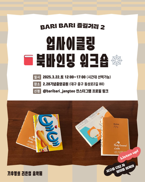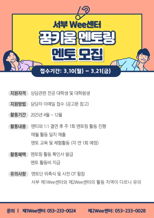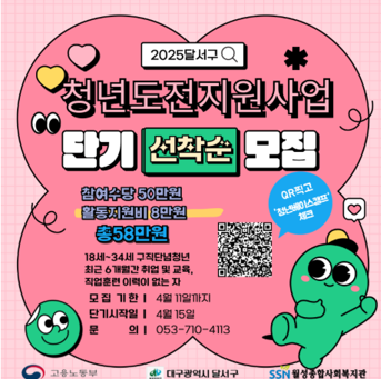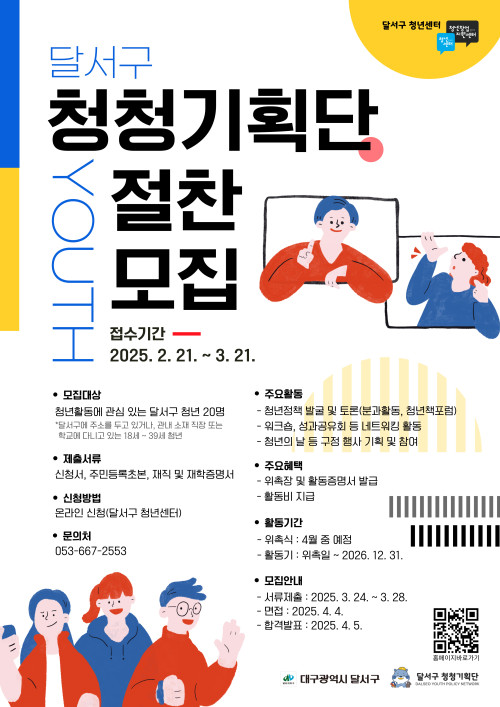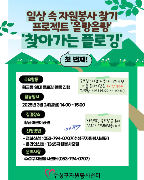 현재 모집 중 검색폼 대구광역시는 해당 페이지를 정보제공을 위한 목적으로 플랫폼을 운영하며, 각 게시글의 내용 및 운영방침에 대한 책임을 지지 않습니다. 대구광역시청년센터 사업 모아보기 전체보기 분야 : 전체 지원사업 채용/인턴/알바 기자단/서포터즈/자원봉사 공모전 교육/강연/토론 축제/공연/전시 커뮤니티활동 기타 정렬 : 전체 신규등록순 모집마감순 상태 : 전체 진행중 종료 기간 설정 검색 검색어 입력 꿀정보등록 누구나 쉽고 빠르게 청년정보를 등록하여 홍보할 수 있습니다. 전체선택 종료 2025년 서부Wee센터 꿈키움 멘토링 멘토 모집 공고 대구서부교육지원청 제1, 2Wee센터 ~ 2025.03.21 종료 [수성구자원봉사센터] 2025 찾아가는 플로깅 1탄! / 일상 속 자원봉사 찾기 프로젝트 '올랑올랑'(오전/오후) 수성구자원봉사센터 ~ 2025.03.21 종료 3월 쓰레기없는 로컬장터 BARI BARI 🧚♂️BARI BARI 즐길거리🧚♂️ 바리바리 ~ 2025.03.21 종료 2025년 제 7기 달서구 청청기획단 모집✨️ 달서구 청년센터 ~ 2025.03.21 종료 기후정의 리쓴업 음악제: 지구를 디딘 자 정의를 외쳐라 생명평화아시아·바리바리 ~ 2025.03.21 종료 2025년 청문당 청년예술가지원사업 공모 (재)행복북구문화재단 ~ 2025.03.21 종료 2025청년도전지원사업 달서구청년도전지원사업본부 ~ 2025.03.20 종료 대구 일·생활균형 지원사업 설명회 대구광역시행복진흥사회서비스원 일생활균형지원센터 ~ 2025.03.19 211 212 213 214 215 216 217 218 219 220