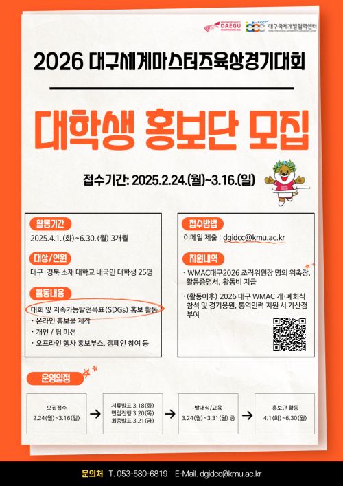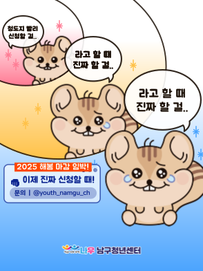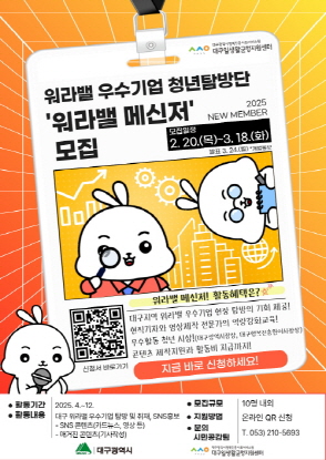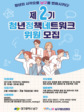 현재 모집 중 검색폼 대구광역시는 해당 페이지를 정보제공을 위한 목적으로 플랫폼을 운영하며, 각 게시글의 내용 및 운영방침에 대한 책임을 지지 않습니다. 대구광역시청년센터 사업 모아보기 전체보기 분야 : 전체 지원사업 채용/인턴/알바 기자단/서포터즈/자원봉사 공모전 교육/강연/토론 축제/공연/전시 커뮤니티활동 기타 정렬 : 전체 신규등록순 모집마감순 상태 : 전체 진행중 종료 기간 설정 검색 검색어 입력 꿀정보등록 누구나 쉽고 빠르게 청년정보를 등록하여 홍보할 수 있습니다. 전체선택 종료 2025 바이오/의약분야 품질분석 양성과정 교육생 모집 한국여성과학기술인육성재단 ~ 2025.03.19 종료 개그맨 김영철과 함께하는 달서희망인문극장 대구광역시 달서구 ~ 2025.03.18 종료 워라밸 우수기업 청년탐방단 '워라밸 메신저' 모집 대구광역시행복진흥사회서비스원 일생활균형지원센터 ~ 2025.03.18 종료 [전액국비지원] 스마트 패션디자이너 양성과정 ( IT기술과 기초봉제의 융합! ) 경북산업직업전문학교 ~ 2025.03.17 종료 2025청년도전지원사업 달서구청년도전지원사업본부 ~ 2025.03.16 종료 2026 대구세계마스터즈육상경기대회 대학생 홍보단 모집 대구국제개발협력센터 ~ 2025.03.16 종료 2025 남구 청년도전지원사업 중기과정 모집 남구청년센터 ~ 2025.03.16 종료 제2기 남구청년정책네트워크 모집 남구청년센터 ~ 2025.03.16 211 212 213 214 215 216 217 218 219 220