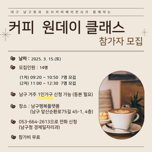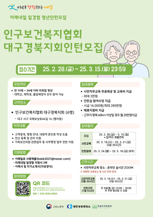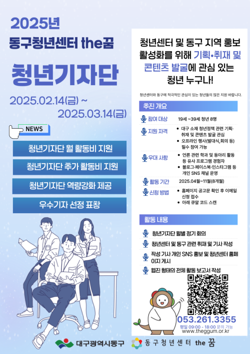 현재 모집 중 검색폼 대구광역시는 해당 페이지를 정보제공을 위한 목적으로 플랫폼을 운영하며, 각 게시글의 내용 및 운영방침에 대한 책임을 지지 않습니다. 대구광역시청년센터 사업 모아보기 전체보기 분야 : 전체 지원사업 채용/인턴/알바 기자단/서포터즈/자원봉사 공모전 교육/강연/토론 축제/공연/전시 커뮤니티활동 기타 정렬 : 전체 신규등록순 모집마감순 상태 : 전체 진행중 종료 기간 설정 검색 검색어 입력 꿀정보등록 누구나 쉽고 빠르게 청년정보를 등록하여 홍보할 수 있습니다. 전체선택 종료 2025년 미래내일 일경험 [인구보건복지협회 대구경북지회] 인턴십 참여자 모집 (주)빛솔인재개발원 ~ 2025.03.15 종료 남구청년센터 채용공고 남구청년센터 ~ 2025.03.15 종료 커피 원데이클래스 참가자 모집 대구광역시 남구청 ~ 2025.03.14 대구광역시청년센터 종료 「2025 지역 중소기업 청년고용 지원사업」 참여기업 모집공고 대구광역시청년센터 ~ 2025.03.14 종료 [동구청년센터 the꿈] 2025년 청년기자단 모집 동구청년센터 the꿈 ~ 2025.03.14 종료 2025청년도전지원사업 달서구청년도전지원사업본부 ~ 2025.03.13 종료 기후정의 리쓴업 음악제 2025 ‘리쓴이’ 모집 생명평화아시아·바리바리 ~ 2025.03.12 대구광역시청년센터 종료 청년카페 <카페지기> 모집 대구광역시청년센터 ~ 2025.03.12 211 212 213 214 215 216 217 218 219 220