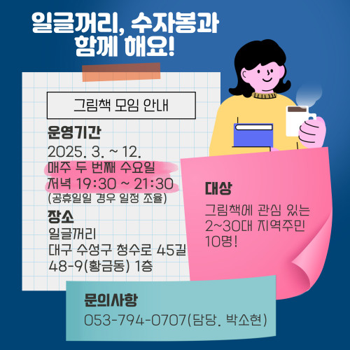 현재 모집 중 검색폼 대구광역시는 해당 페이지를 정보제공을 위한 목적으로 플랫폼을 운영하며, 각 게시글의 내용 및 운영방침에 대한 책임을 지지 않습니다. 대구광역시청년센터 사업 모아보기 전체보기 분야 : 전체 지원사업 채용/인턴/알바 기자단/서포터즈/자원봉사 공모전 교육/강연/토론 축제/공연/전시 커뮤니티활동 기타 정렬 : 전체 신규등록순 모집마감순 상태 : 전체 진행중 종료 기간 설정 검색 검색어 입력 꿀정보등록 누구나 쉽고 빠르게 청년정보를 등록하여 홍보할 수 있습니다. 전체선택 종료 [수성구자원봉사센터] 그림책 모임 참여자 모집! 수성구자원봉사센터 ~ 2025.03.05 종료 2025년 제16기 사회리더 대학생 멘토링 멘티 모집 한국장학재단 ~ 2025.03.05 종료 [전액국비지원] BIM 실내건축 설계 디자이너 과정 | 최신 기술로 나만의 설계 전문가 되기! 경북산업직업전문학교 ~ 2025.03.05 종료 대구퀴어문화축제 기획단 모집 대구퀴어문화축제 ~ 2025.03.03 종료 영화동아리 [더보기] 동아리원 모집 대구광역시청소년문화의집 꼼지락발전소 ~ 2025.03.03 종료 걷기 동아리 [걷는사이] 동아리원 모집 대구광역시청소년문화의집 꼼지락발전소 ~ 2025.03.03 종료 대구문학관 기획 2025 대구시민주간 프로그램 대구문학관 ~ 2025.03.02 종료 2025년 수성구 청년도전지원사업 참여자 모집 수성대학교 산학협력단 ~ 2025.03.01 221 222 223 224 225 226 227 228 229 230