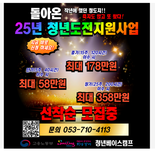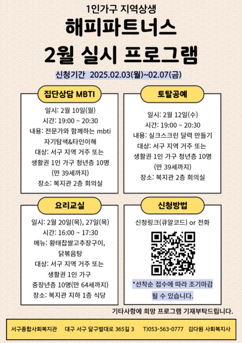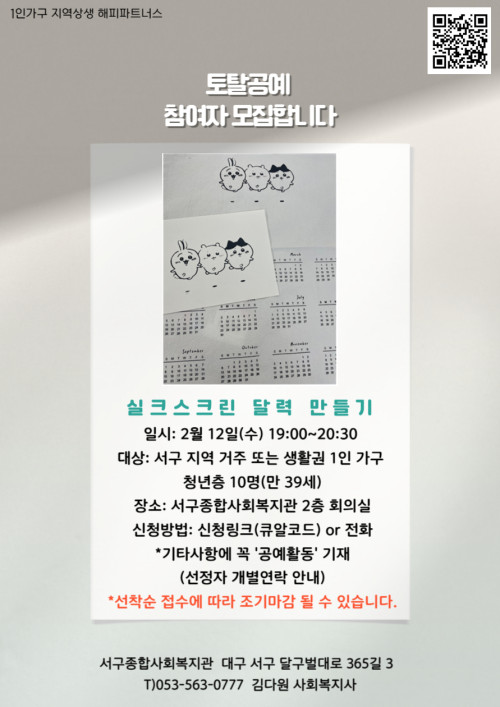 현재 모집 중 검색폼 대구광역시는 해당 페이지를 정보제공을 위한 목적으로 플랫폼을 운영하며, 각 게시글의 내용 및 운영방침에 대한 책임을 지지 않습니다. 대구광역시청년센터 사업 모아보기 전체보기 분야 : 전체 지원사업 채용/인턴/알바 기자단/서포터즈/자원봉사 공모전 교육/강연/토론 축제/공연/전시 커뮤니티활동 기타 정렬 : 전체 신규등록순 모집마감순 상태 : 전체 진행중 종료 기간 설정 검색 검색어 입력 꿀정보등록 누구나 쉽고 빠르게 청년정보를 등록하여 홍보할 수 있습니다. 전체선택 종료 2025청년도전지원사업 달서구청년도전지원사업본부 ~ 2025.02.07 종료 해피파트너스 2월 토탈공예 참여자 모집 서구종합사회복지관 ~ 2025.02.07 종료 해피파트너스 2월 실시 프로그램 안내 서구종합사회복지관 ~ 2025.02.07 종료 2025년 제1차 대구지역인적자원개발위원회 직원 채용 재공고 대구상공회의소 ~ 2025.02.07 종료 남구 청년도전지원사업 × 채용트렌드 2025 남구청년센터 ~ 2025.02.06 종료 [전액국비무료] ERP (물류,생산,회계,인사) + 전산회계1급&전산세무2급 영진직업전문학교 ~ 2025.02.04 종료 2025 창작의 쉼표 참여자 1기 모집 창작의 쉼표 ~ 2025.02.01 종료 [2025.02] 월간클라인 - 와인 커뮤니티 데이 (주)클라인 ~ 2025.01.31 231 232 233 234 235 236 237 238 239 240
