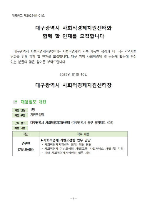 현재 모집 중 검색폼 대구광역시는 해당 페이지를 정보제공을 위한 목적으로 플랫폼을 운영하며, 각 게시글의 내용 및 운영방침에 대한 책임을 지지 않습니다. 대구광역시청년센터 사업 모아보기 전체보기 분야 : 전체 지원사업 채용/인턴/알바 기자단/서포터즈/자원봉사 공모전 교육/강연/토론 축제/공연/전시 커뮤니티활동 기타 정렬 : 전체 신규등록순 모집마감순 상태 : 전체 진행중 종료 기간 설정 검색 검색어 입력 꿀정보등록 누구나 쉽고 빠르게 청년정보를 등록하여 홍보할 수 있습니다. 전체선택 종료 [AI커리어스쿨X미니컴퍼니C in 대구] 교육&실무 한번에 클리어! AI 좀 다룰 줄 아는 콘텐츠 마케터가 되고 싶은 사람 모여라! (~1/21) 오픈놀 ~ 2025.01.21 종료 2025청년도전지원사업 달서구청년도전지원사업본부 ~ 2025.01.20 종료 [채용공고] 대구광역시 사회적경제지원센터 연구원 채용 공고(재공고) (~1/20 13:00까지 접수) 대구광역시사회적경제지원센터 ~ 2025.01.20 종료 [경북대학교 창업지원단] 스타트업허브센터 입주기업 모집 공고 (~1/20 18:00까지) 경북대학교 창업지원단 ~ 2025.01.20 종료 <책으로 선배를 만나요!> 책으로 마음잇기 5기 청년(호호) 참여자 모집(마감) 책연 ~ 2025.01.19 대구광역시청년센터 종료 [제2025-01호] 대구광역시청년센터 인재채용 공고 대구광역시청년센터 ~ 2025.01.19 종료 2025년 제1차 대구지역인적자원개발위원회 직원 채용 공고 대구지역인적자원개발위원회(대구상공회의소) ~ 2025.01.19 종료 1월 독서산책 모집 (<사랑과 통제와 맥주 한잔의 자유> 책모임) 치우친 취향 ~ 2025.01.19 231 232 233 234 235 236 237 238 239 240