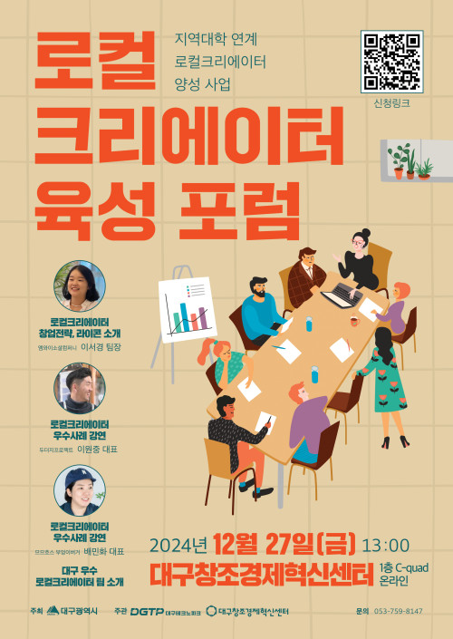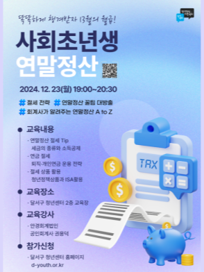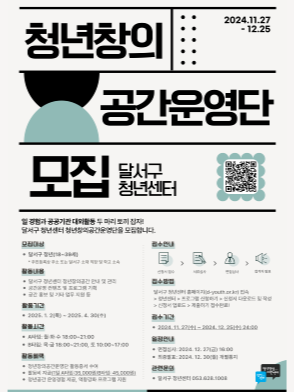 현재 모집 중 검색폼 대구광역시는 해당 페이지를 정보제공을 위한 목적으로 플랫폼을 운영하며, 각 게시글의 내용 및 운영방침에 대한 책임을 지지 않습니다. 대구광역시청년센터 사업 모아보기 전체보기 분야 : 전체 지원사업 채용/인턴/알바 기자단/서포터즈/자원봉사 공모전 교육/강연/토론 축제/공연/전시 커뮤니티활동 기타 정렬 : 전체 신규등록순 모집마감순 상태 : 전체 진행중 종료 기간 설정 검색 검색어 입력 꿀정보등록 누구나 쉽고 빠르게 청년정보를 등록하여 홍보할 수 있습니다. 전체선택 종료 로컬크리에이터 육성 포럼 참가자 모집 대구테크노파크 / 대구창조경제혁신센터 ~ 2024.12.26 종료 [구글닷오알지 후원] 지역 대학생 AI 커리어 스쿨 해커톤 참가자 모집 중 루트임팩트 ~ 2024.12.26 종료 토요낮산책 (<금빛 종소리>책읽기 모임) 치우친 취향 ~ 2024.12.26 종료 2024년 한정수량 블프 이벤트 (주)디지스타트업 인큐베이터 ~ 2024.12.26 종료 [달서구 청년센터] 청년창의 공간운영단 모집 달서구 청년센터 ~ 2024.12.25 종료 [전액국비무료] 물류관리 및 ERP운용 (회계, 인사, 생산, 물류) + 전산회계 영진직업전문학교 ~ 2024.12.23 종료 달서구 청년센터 사회초년생 연말정산 특강 달서구 청년센터 ~ 2024.12.22 종료 [NOF] 공부하면서 돈버는 서비스 오픈 모티어스 ~ 2024.12.22 231 232 233 234 235 236 237 238 239 240