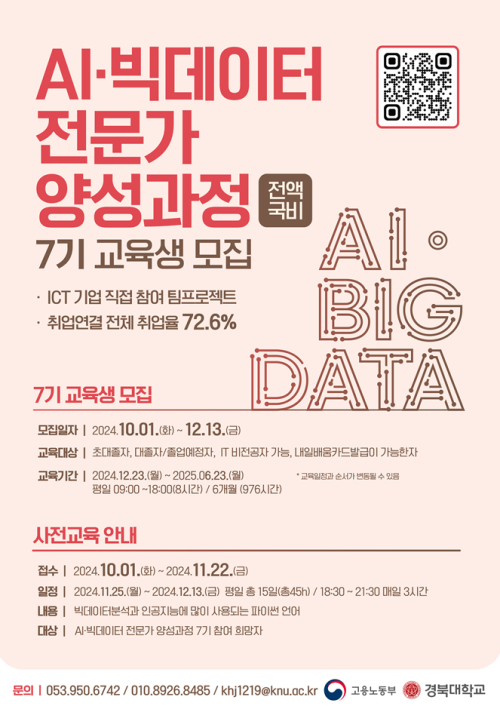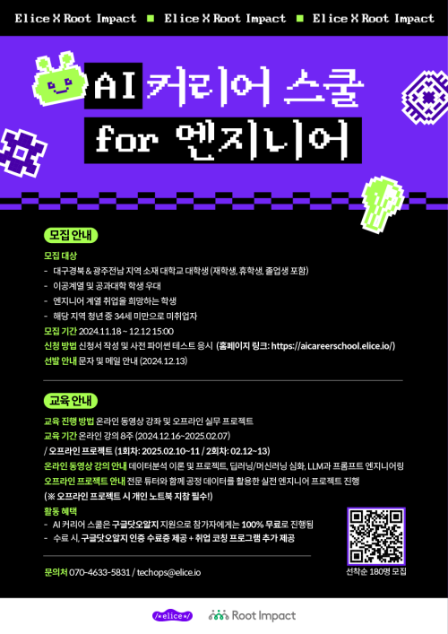 현재 모집 중 검색폼 대구광역시는 해당 페이지를 정보제공을 위한 목적으로 플랫폼을 운영하며, 각 게시글의 내용 및 운영방침에 대한 책임을 지지 않습니다. 대구광역시청년센터 사업 모아보기 전체보기 분야 : 전체 지원사업 채용/인턴/알바 기자단/서포터즈/자원봉사 공모전 교육/강연/토론 축제/공연/전시 커뮤니티활동 기타 정렬 : 전체 신규등록순 모집마감순 상태 : 전체 진행중 종료 기간 설정 검색 검색어 입력 꿀정보등록 누구나 쉽고 빠르게 청년정보를 등록하여 홍보할 수 있습니다. 전체선택 종료 2024년 달성청년 문화의 밤(달문밤) 행사 개최 안내 달성청년혁신센터 ~ 2024.12.13 종료 AI·빅데이터 전문가 양성과정 7기 교육생 모집 경북대학교 데이터융복합연구원 ~ 2024.12.13 종료 2024 온라인 정보보호 토크콘서트 한국정보보호산업협회 ~ 2024.12.12 종료 💡[행사안내] 2024년 ESG 리빙랩 매칭데이에 참여하세요!💡 전자정보기기사업단 ~ 2024.12.12 종료 AI 커리어 스쿨 for 엔지니어 교육 모집 중 (이공계 집중! 구글닷오알지 인증 수료증 제공) 루트임팩트 ~ 2024.12.12 종료 현업인과 함께하는 콘텐츠 제작 A to Z <릴레이 콘텐츠 워크숍> 참여자 모집 대구시청자미디어센터 ~ 2024.12.12 종료 대구예술발전소 <예술가의 서재> - 해금연주자 최버들/극작가 박지수 대구문화예술진흥원 대구예술발전소 ~ 2024.12.12 종료 2024 대구아트웨이 윈터아트페스타 <책방지기와의 만남> 참여자 모집 (재)대구문화예술진흥원(대구아트웨이) ~ 2024.12.11 241 242 243 244 245 246 247 248 249 250