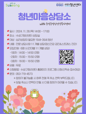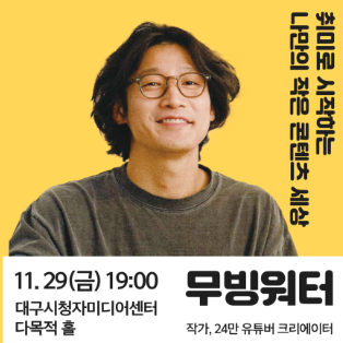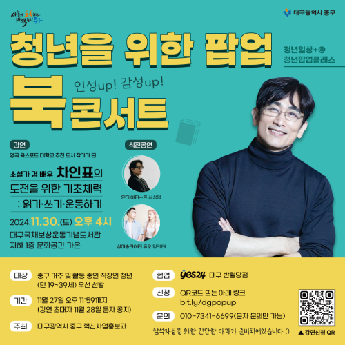 현재 모집 중 검색폼 대구광역시는 해당 페이지를 정보제공을 위한 목적으로 플랫폼을 운영하며, 각 게시글의 내용 및 운영방침에 대한 책임을 지지 않습니다. 대구광역시청년센터 사업 모아보기 전체보기 분야 : 전체 지원사업 채용/인턴/알바 기자단/서포터즈/자원봉사 공모전 교육/강연/토론 축제/공연/전시 커뮤니티활동 기타 정렬 : 전체 신규등록순 모집마감순 상태 : 전체 진행중 종료 기간 설정 검색 검색어 입력 꿀정보등록 누구나 쉽고 빠르게 청년정보를 등록하여 홍보할 수 있습니다. 전체선택 종료 [대구시청자미디어센터]11월 고전영화 상영회 안내 영화<오발탄> 대구시청자미디어센터 ~ 2024.11.28 종료 ✨청년마음상담소OPEN✨ 수성구청년센터 ~ 2024.11.28 종료 대구 1인미디어센터 LEVEL UP 토크콘서트 대구디지털혁신진흥원 ~ 2024.11.28 종료 2024 대구 중구 청년일상+@ 청년팝업클래스 <인성up! 감성up! 청년을 위한 팝업 북 콘서트> 대구광역시 중구 혁신사업홍보실 주최·주관 / 현대사회(운영사) ~ 2024.11.27 종료 [ 소셜취업플러스프로젝트 ] 취업역량교육 자기이해 및 진로설정 부문 참가자 모집 (~11/25) (사)함께만드는세상 ~ 2024.11.27 종료 [행사명: 2024년 정보화 아카데미 IT/SW 신기술 특강] /1부: 카카오 모빌리티/ 2부: 네카라쿠배 (재)대구디지털혁신진흥원 ~ 2024.11.27 종료 [ 소셜취업플러스프로젝트 ] 취업역량교육 자기관리 부문 참가자 모집 (사)함께만드는세상 ~ 2024.11.27 종료 대구 1인미디어센터 LEVEL UP 토크콘서트 대구디지털혁신진흥원 ~ 2024.11.26 241 242 243 244 245 246 247 248 249 250