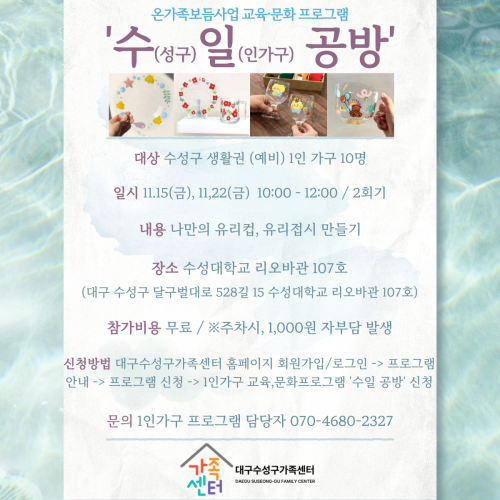 현재 모집 중 검색폼 대구광역시는 해당 페이지를 정보제공을 위한 목적으로 플랫폼을 운영하며, 각 게시글의 내용 및 운영방침에 대한 책임을 지지 않습니다. 대구광역시청년센터 사업 모아보기 전체보기 분야 : 전체 지원사업 채용/인턴/알바 기자단/서포터즈/자원봉사 공모전 교육/강연/토론 축제/공연/전시 커뮤니티활동 기타 정렬 : 전체 신규등록순 모집마감순 상태 : 전체 진행중 종료 기간 설정 검색 검색어 입력 꿀정보등록 누구나 쉽고 빠르게 청년정보를 등록하여 홍보할 수 있습니다. 전체선택 종료 청년들을 위한 인문집단프로그램 <생각사이-다> 청년31기 모집 (온라인 진행) 가톨릭대학교 김수환추기경연구소 ~ 2024.11.17 종료 2024년 대구청년 슬기로운 인생계획 지원사업_[슬생특강 2회차 <깡미>] 대구광역시, (재)대구창조경제혁신센터 ~ 2024.11.17 종료 2024 대구생활문화센터 생활문화교실 특별강좌(무료강의) 대구생활문화센터 ~ 2024.11.16 종료 🍁 [2024 누리 한마당 장터] 가을의 마지막 낭만을 즐겨보세요! 🎨✨ 난춘 주식회사 ~ 2024.11.15 종료 덕업일치 아카데미 스마트스토어 마케팅 전략 특강 수성구청년센터 ~ 2024.11.15 종료 1인가구 교육 문화프로그램(유리 공예) 대구수성구가족센터 ~ 2024.11.15 종료 <1인가구 1 For U 페스타> 서구종합사회복지관 ~ 2024.11.15 종료 전액 국비무료 영진직업전문학교 ~ 2024.11.15 251 252 253 254 255 256 257 258 259 260