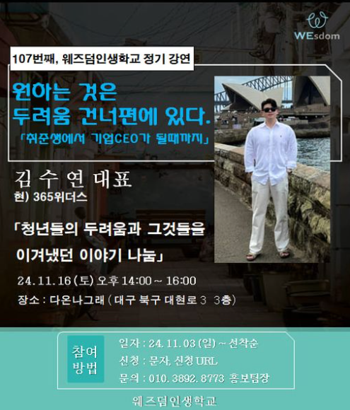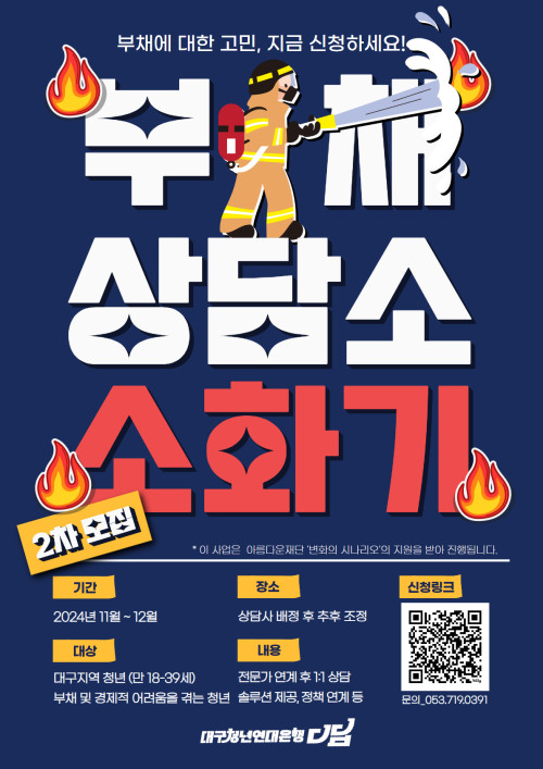 현재 모집 중 검색폼 대구광역시는 해당 페이지를 정보제공을 위한 목적으로 플랫폼을 운영하며, 각 게시글의 내용 및 운영방침에 대한 책임을 지지 않습니다. 대구광역시청년센터 사업 모아보기 전체보기 분야 : 전체 지원사업 채용/인턴/알바 기자단/서포터즈/자원봉사 공모전 교육/강연/토론 축제/공연/전시 커뮤니티활동 기타 정렬 : 전체 신규등록순 모집마감순 상태 : 전체 진행중 종료 기간 설정 검색 검색어 입력 꿀정보등록 누구나 쉽고 빠르게 청년정보를 등록하여 홍보할 수 있습니다. 전체선택 종료 [강연] 취준생에서 CEO가 될 때까지 웨즈덤인생학교 ~ 2024.11.15 종료 청년부채상담소 '소화기' 2차모집! 대구청년연대은행 디딤 ~ 2024.11.15 종료 [ 북토크 ] '낯선 골목길을 걷는 디자이너' 정재완 대구지속가능발전협의회 도시공동체분과 ~ 2024.11.15 대구광역시청년센터 종료 2024 사회진입활동지원금 상담연결형[청년상담소] 참여자 모집 대구광역시청년센터 ~ 2024.11.15 종료 (2024년 동네상권발전소 지원사업) 북성로 수공예 체험 한국재생아트연구협회 ~ 2024.11.14 종료 2024년 대구콘텐츠코리아랩 슈퍼세미나 시즌 2 [7회차-대학내일 미디어센터 홍승우 센터장 (재)대구디지털혁신진흥원 ~ 2024.11.14 종료 AI활용 제품 홍보를 위한 숏폼 제작 (재)대구테크노파크 스타트라인 ~ 2024.11.14 종료 [2024년 제2차 미래플랜아카데미 행사에 여러분을 초대합니다!(초청강사 : 박위)] 대구 서구청 ~ 2024.11.14 251 252 253 254 255 256 257 258 259 260