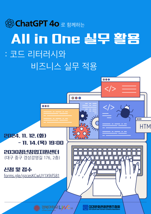 현재 모집 중 검색폼 대구광역시는 해당 페이지를 정보제공을 위한 목적으로 플랫폼을 운영하며, 각 게시글의 내용 및 운영방침에 대한 책임을 지지 않습니다. 대구광역시청년센터 사업 모아보기 전체보기 분야 : 전체 지원사업 채용/인턴/알바 기자단/서포터즈/자원봉사 공모전 교육/강연/토론 축제/공연/전시 커뮤니티활동 기타 정렬 : 전체 신규등록순 모집마감순 상태 : 전체 진행중 종료 기간 설정 검색 검색어 입력 꿀정보등록 누구나 쉽고 빠르게 청년정보를 등록하여 홍보할 수 있습니다. 전체선택 종료 ChatGPT 4o로 함께하는 AIl in One 실무활용 : 노코딩 데이터 분석과 비즈니스 실무 적용 교육 경북대학교 LINC 3.0 사업단 ~ 2024.11.14 종료 ▶미래내일일경험 인턴형◀ 인턴 참여자 모집(~11/14까지) (주)일로이룸 ~ 2024.11.14 종료 2024년 정보보호 전문교육 안내 대구정보보호지원센터 ~ 2024.11.14 종료 작가콜로퀴엄 인문예술과학특강 <2024 문학만개> (사)대구작가콜로퀴엄 ~ 2024.11.14 종료 [수성청년네트워크] 성과공유회 참여자모집! 수성구청년센터 ~ 2024.11.13 종료 신입직원을 위한 힐링 온보딩(웨이마크 직무적성검사 4만원 상당 무료제공!) (사)경북시민재단 ~ 2024.11.12 종료 2024 청년과 함께하는 도시농업 치유프로그램 강정보여울협동조합 ~ 2024.11.12 종료 재직자 실무 맞춤 교육 참가 재직자 모집 (~11/12) 대구경북지역혁신플랫폼 전자정보기기사업단 ~ 2024.11.12 251 252 253 254 255 256 257 258 259 260