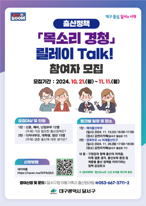 현재 모집 중 검색폼 대구광역시는 해당 페이지를 정보제공을 위한 목적으로 플랫폼을 운영하며, 각 게시글의 내용 및 운영방침에 대한 책임을 지지 않습니다. 대구광역시청년센터 사업 모아보기 전체보기 분야 : 전체 지원사업 채용/인턴/알바 기자단/서포터즈/자원봉사 공모전 교육/강연/토론 축제/공연/전시 커뮤니티활동 기타 정렬 : 전체 신규등록순 모집마감순 상태 : 전체 진행중 종료 기간 설정 검색 검색어 입력 꿀정보등록 누구나 쉽고 빠르게 청년정보를 등록하여 홍보할 수 있습니다. 전체선택 종료 경북대대학원 인문카운슬링학과 설명회 경북대학교대학원 인문카운슬링학과 ~ 2024.11.11 종료 RISE 아카데미 디지털 리터러시 2차 교육 참가 학생 모집 (~11/11) 대구경북지역혁신플랫폼 전자정보기기사업단 ~ 2024.11.11 종료 「출산 정책 '목소리 경청' 릴레이 Talk!」 참여자 모집 달서구청 아동가족과 출산장려팀 ~ 2024.11.11 종료 [제2회 단디JOB자 기업탐방] - 상신브레이크(주) (사)대구시민재단 ~ 2024.11.10 종료 골목길 경제학자, 모종린 교수의 북콘서트(크리에이터 소사이어티) 청도혁신센터 ~ 2024.11.10 종료 [프로젝트 : 청춘다이브] 🤿 청춘에 뛰어들다 대구문화예술진흥원 ~ 2024.11.10 종료 [2024년 청년테마별] 1:1 맞춤형 집중 무료 취업 컨설팅 대구상공회의소 ~ 2024.11.10 종료 대구예술발전소 작가와의 만남 시리즈 <건축가의 공간일기> 조성익 작가편 대구문화예술진흥원 대구예술발전소 ~ 2024.11.08 251 252 253 254 255 256 257 258 259 260