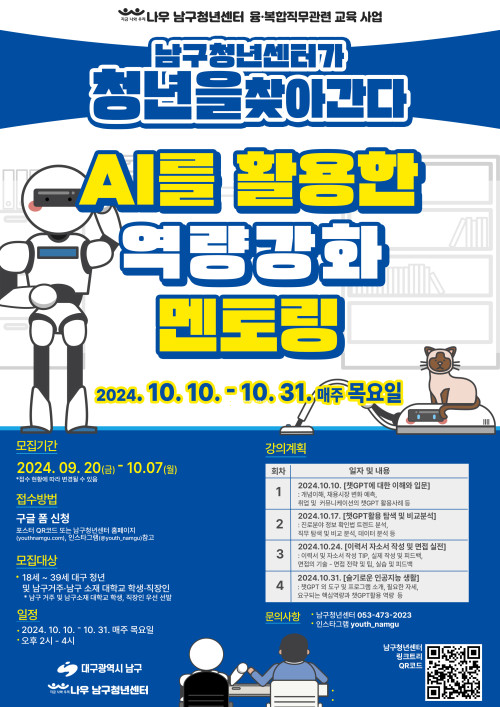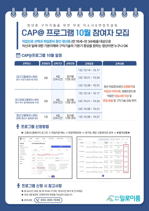 현재 모집 중 검색폼 대구광역시는 해당 페이지를 정보제공을 위한 목적으로 플랫폼을 운영하며, 각 게시글의 내용 및 운영방침에 대한 책임을 지지 않습니다. 대구광역시청년센터 사업 모아보기 전체보기 분야 : 전체 지원사업 채용/인턴/알바 기자단/서포터즈/자원봉사 공모전 교육/강연/토론 축제/공연/전시 커뮤니티활동 기타 정렬 : 전체 신규등록순 모집마감순 상태 : 전체 진행중 종료 기간 설정 검색 검색어 입력 꿀정보등록 누구나 쉽고 빠르게 청년정보를 등록하여 홍보할 수 있습니다. 전체선택 종료 [AI 및 챗GPT를 활용한 역량 강화 멘토링] 융복합 직무관련 교육 프로그램 남구청년센터 ~ 2024.10.31 종료 여성암검진받고! 편의점 쿠폰받자! 국민건강보험공단대구경북지역본부 ~ 2024.10.31 대구광역시청년센터 종료 2024 청년도전지원사업 젊핑 <도전 5주 프로그램> 참여자 모집 대구광역시청년센터 ~ 2024.10.31 종료 ✨LOCAL CAPSTONE DESIGN 캠프 모집 중✨ 경북대학교 LINC3.0 ~ 2024.10.31 종료 청년층 구직자&취준생들을 위한 무료 자소서&면접 컨설팅을 제공해주는 구직자 취업역량강화프로그램 (주)일로이룸 ~ 2024.10.31 대구광역시청년센터 종료 2024 청년도전지원사업 젊핑 <도전+25주 프로그램> 참여자 모집 대구광역시청년센터 ~ 2024.10.31 종료 2024년 해피파트너스 참여자 모집 서구종합사회복지관 ~ 2024.10.31 종료 2030 청년 맞춤형 재무상담 금융어드바이저 서비스 사업 금융공익재단 ~ 2024.10.31 251 252 253 254 255 256 257 258 259 260