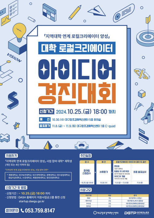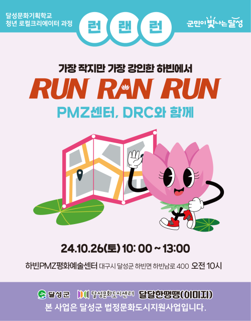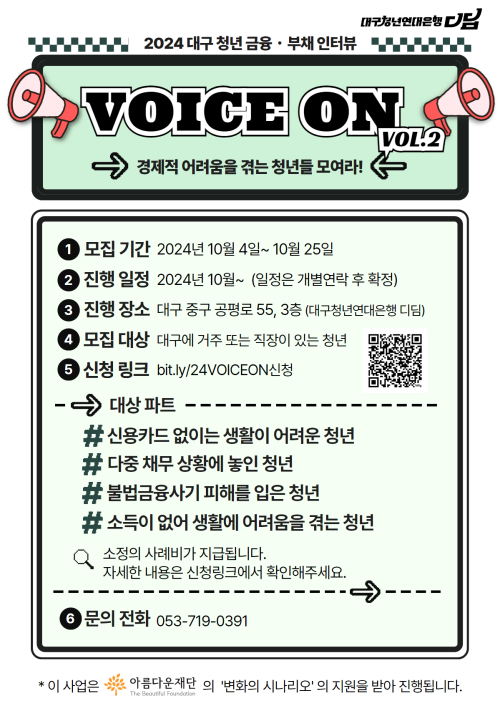 현재 모집 중 검색폼 대구광역시는 해당 페이지를 정보제공을 위한 목적으로 플랫폼을 운영하며, 각 게시글의 내용 및 운영방침에 대한 책임을 지지 않습니다. 대구광역시청년센터 사업 모아보기 전체보기 분야 : 전체 지원사업 채용/인턴/알바 기자단/서포터즈/자원봉사 공모전 교육/강연/토론 축제/공연/전시 커뮤니티활동 기타 정렬 : 전체 신규등록순 모집마감순 상태 : 전체 진행중 종료 기간 설정 검색 검색어 입력 꿀정보등록 누구나 쉽고 빠르게 청년정보를 등록하여 홍보할 수 있습니다. 전체선택 종료 런랜런(RUN RAN RUN), 달성군 하빈면 마을체험과 달리기 축제 달성문화도시센터 ~ 2024.10.25 종료 [대구시청자미디어센터] 배리어프리 영화&고전영화 상영회 안내 (10/24~10/25) 대구시청자미디어센터 ~ 2024.10.25 종료 대학 로컬크리에이터 경진대회 대구테크노파크 / 대구창조경제혁신센터 ~ 2024.10.25 종료 [2024 대구 청년 금융부채 인터뷰 'VOICE ON' vol.2] 대구청년연대은행디딤 ~ 2024.10.25 종료 24년 소셜캠퍼스 온 대구 활성화프로그램[카페메뉴 만들기] 참여자 모집! 한국사회적기업진흥원, 더꿈협동조합 ~ 2024.10.24 종료 출퇴근 시간대 도로주행 실험단 참가자 모집 협동조합소이랩 ~ 2024.10.23 종료 제2회 동구 청년 문화제「청년 The꿈 페스타」 동구청년센터 the꿈 ~ 2024.10.23 종료 3D기술을 활용한 시제품 제작-캐릭터조명제작 (재)대구테크노파크 스타트라인 ~ 2024.10.23 261 262 263 264 265 266 267 268 269 270