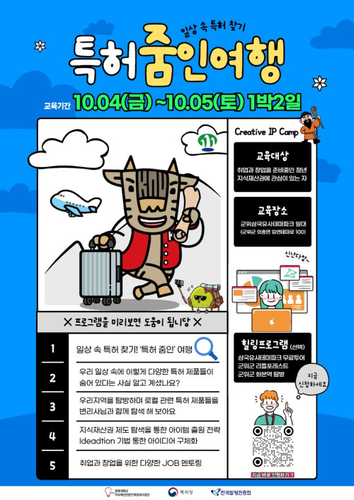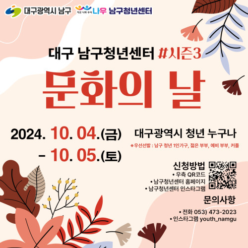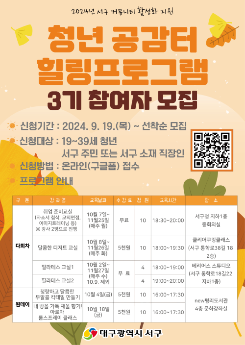 현재 모집 중 검색폼 대구광역시는 해당 페이지를 정보제공을 위한 목적으로 플랫폼을 운영하며, 각 게시글의 내용 및 운영방침에 대한 책임을 지지 않습니다. 대구광역시청년센터 사업 모아보기 전체보기 분야 : 전체 지원사업 채용/인턴/알바 기자단/서포터즈/자원봉사 공모전 교육/강연/토론 축제/공연/전시 커뮤니티활동 기타 정렬 : 전체 신규등록순 모집마감순 상태 : 전체 진행중 종료 기간 설정 검색 검색어 입력 꿀정보등록 누구나 쉽고 빠르게 청년정보를 등록하여 홍보할 수 있습니다. 전체선택 종료 2024년 하반기 대구·경북 대학생 (연합) IP캠프(특허캠프) 지식재산전문인력양성사업단 ~ 2024.10.03 종료 무료체험부스 운영 축제 월성종합사회복지관,라이프온어스, 청년마루 ~ 2024.10.03 종료 <가을 산책 수첩> 참여자 모집 아무의 방, 이모지 ~ 2024.10.03 종료 남구청년센터 문화의 날 남구청년센터 ~ 2024.10.02 종료 동네배움터 '지속 가능한 그린 라이프' 수강생 모집 서로일상 ~ 2024.10.02 종료 띵크 [이모티콘반 모집] 나만의 이모티콘 제작부터 수익까지! 구로 청년이룸 ~ 2024.10.02 종료 2024년 서구 청년 커뮤니티 활성화 지원 청년공감터 힐링프로그램 3기 참여자 모집 대구 서구청 ~ 2024.10.01 종료 영남제일관 미디어아트 공연, 경품 이벤트 한국콘텐츠진흥원/대구광역시 ~ 2024.10.01 271 272 273 274 275 276 277 278 279 280
