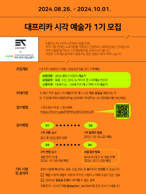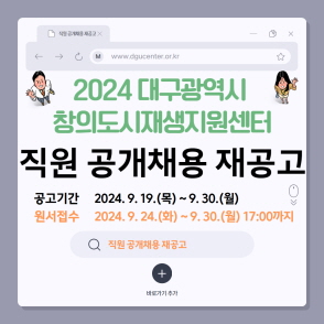현재 모집 중 검색폼 대구광역시는 해당 페이지를 정보제공을 위한 목적으로 플랫폼을 운영하며, 각 게시글의 내용 및 운영방침에 대한 책임을 지지 않습니다. 대구광역시청년센터 사업 모아보기 전체보기 분야 : 전체 지원사업 채용/인턴/알바 기자단/서포터즈/자원봉사 공모전 교육/강연/토론 축제/공연/전시 커뮤니티활동 기타 정렬 : 전체 신규등록순 모집마감순 상태 : 전체 진행중 종료 기간 설정 검색 검색어 입력 꿀정보등록 누구나 쉽고 빠르게 청년정보를 등록하여 홍보할 수 있습니다. 전체선택 종료 클라우드 보안 구축 실무 대구정보보호지원센터 ~ 2024.10.01 대구광역시청년센터 종료 2024 역량강화 멘토링 지원사업 참여자 모집 대구광역시청년센터 ~ 2024.10.01 종료 대프리카 시각 예술가 1기 모집 엔탈트 비영리 단체 ~ 2024.10.01 종료 [레벨업케이션]워케이션 많이 갔으면 조켄네... 서울시 직장인을 위한 힐링 워케이션! 구로 청년이룸 ~ 2024.10.01 종료 AI 영화 제작 입문 대구영상미디어센터 ~ 2024.09.30 종료 [채용공고] 대구광역시 창의도시재생지원센터 직원 공개채용 재공고(~9.30.) 대구광역시 창의도시재생지원센터 ~ 2024.09.30 종료 [인권특강] 기후위기 시대에 필요한 언어, 인권 경북대 인권센터, 생명평화아시아 ~ 2024.09.30 종료 나도 라디오 진행자! 2024 랄랄라 라디오 제작교육 수강생을 모집합니다. 성서공동체FM ~ 2024.09.30 271 272 273 274 275 276 277 278 279 280