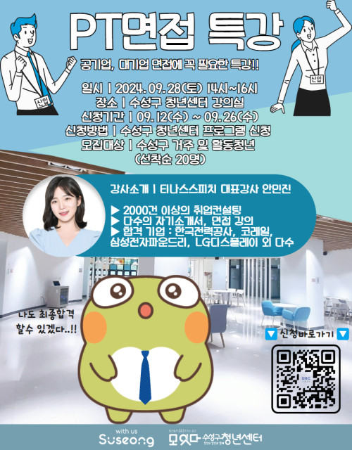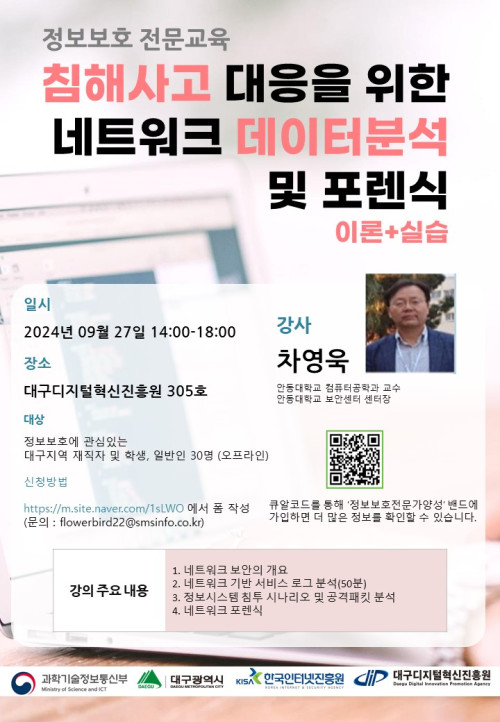 현재 모집 중 검색폼 대구광역시는 해당 페이지를 정보제공을 위한 목적으로 플랫폼을 운영하며, 각 게시글의 내용 및 운영방침에 대한 책임을 지지 않습니다. 대구광역시청년센터 사업 모아보기 전체보기 분야 : 전체 지원사업 채용/인턴/알바 기자단/서포터즈/자원봉사 공모전 교육/강연/토론 축제/공연/전시 커뮤니티활동 기타 정렬 : 전체 신규등록순 모집마감순 상태 : 전체 진행중 종료 기간 설정 검색 검색어 입력 꿀정보등록 누구나 쉽고 빠르게 청년정보를 등록하여 홍보할 수 있습니다. 전체선택 종료 [ 대구투어 ] 대구의 생태와 환경을 알아보는 투어 (선착순 무료) 대구지속가능발전협의회 도시공동체분과 ~ 2024.09.27 종료 다정한 수리생활 🛠 아이폰 배터리 자가교체 워크숍 🔋 더커먼 ~ 2024.09.27 종료 2024년 『로컬ON대구』 2차 포럼 참가신청 (사)커뮤니티와경제 ~ 2024.09.26 종료 취업특강 강좌 수성구 청년센터 ~ 2024.09.26 종료 「2024 소셜리빙랩 청년 포럼:대구 청년 유출 문제」 참여자 모집 더컴퍼니씨협동조합 ~ 2024.09.26 종료 정보보호 전문교육 [침해사고 대응을 위한 네트워크 데이터 분석 및 포렌식] 대구정보보호지원센터 ~ 2024.09.26 종료 2024년 청년문화예술패스 이용자 대상 숏폼 공모전 문화체육관광부, 한국문화예술위원회 ~ 2024.09.26 종료 여행작가가 들려주는 여행이야기 대구남구대덕문화전당 ~ 2024.09.26 271 272 273 274 275 276 277 278 279 280