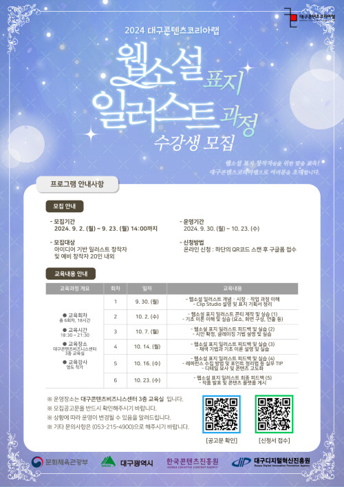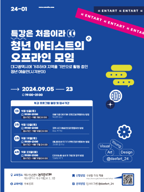 현재 모집 중 검색폼 대구광역시는 해당 페이지를 정보제공을 위한 목적으로 플랫폼을 운영하며, 각 게시글의 내용 및 운영방침에 대한 책임을 지지 않습니다. 대구광역시청년센터 사업 모아보기 전체보기 분야 : 전체 지원사업 채용/인턴/알바 기자단/서포터즈/자원봉사 공모전 교육/강연/토론 축제/공연/전시 커뮤니티활동 기타 정렬 : 전체 신규등록순 모집마감순 상태 : 전체 진행중 종료 기간 설정 검색 검색어 입력 꿀정보등록 누구나 쉽고 빠르게 청년정보를 등록하여 홍보할 수 있습니다. 전체선택 종료 힐링 원예 스칸디아모스 인테리어 작품 만들기 사회적협동조합 청년마루 ~ 2024.09.23 종료 [청년 MBTI 집단상담 참여자 모집!] 서구종합사회복지관 ~ 2024.09.23 종료 2024년 대구콘텐츠코리아랩 크리에이터 아카데미 웹툰 티저 메이킹 과정 참가자 모집 (재)대구디지털혁신진흥원 ~ 2024.09.23 종료 2024년 대구콘텐츠코리아랩 크리에이터 아카데미 웹소설 표지 일러스트 과정 참가자 모집 (재)대구디지털혁신진흥원 ~ 2024.09.23 종료 2024 DMZ OPEN 정책 공모전 경기도청 북부청사 ~ 2024.09.23 종료 [특강] 청년 아티스트의 오프라인 모임 엔탈트비영리단체 ~ 2024.09.23 종료 2024년 재직자 실무역량 강화를 위한 온라인 과정 4차 한국여성과학기술인육성재단 ~ 2024.09.23 종료 남구청년센터 문화아카데미 「언어교환 파티」 남구청년센터 ~ 2024.09.22 271 272 273 274 275 276 277 278 279 280