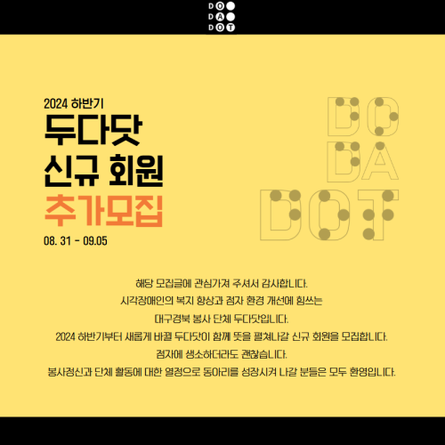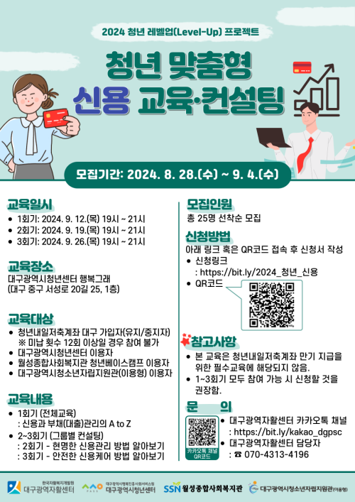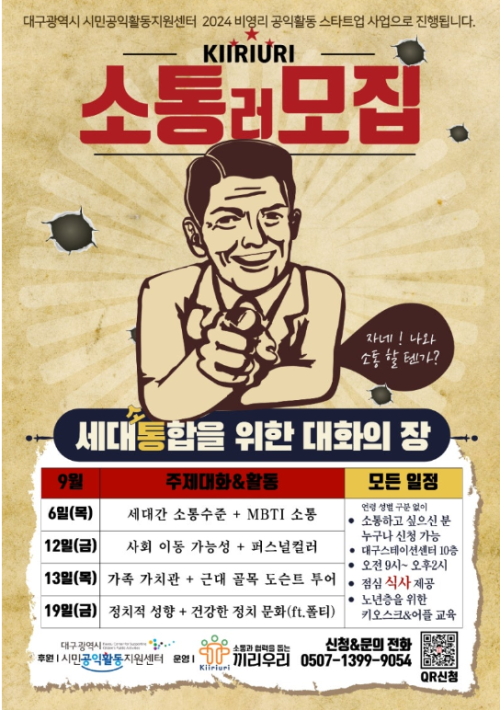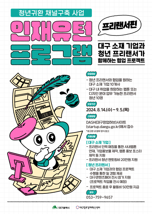 현재 모집 중 검색폼 대구광역시는 해당 페이지를 정보제공을 위한 목적으로 플랫폼을 운영하며, 각 게시글의 내용 및 운영방침에 대한 책임을 지지 않습니다. 대구광역시청년센터 사업 모아보기 전체보기 분야 : 전체 지원사업 채용/인턴/알바 기자단/서포터즈/자원봉사 공모전 교육/강연/토론 축제/공연/전시 커뮤니티활동 기타 정렬 : 전체 신규등록순 모집마감순 상태 : 전체 진행중 종료 기간 설정 검색 검색어 입력 꿀정보등록 누구나 쉽고 빠르게 청년정보를 등록하여 홍보할 수 있습니다. 전체선택 대구광역시청년센터 종료 2024 제10회 대구청년주간 '대구청년가요제' 참가자 모집 대구광역시청년센터 ~ 2024.09.06 종료 907 기후정의행진 대구참가단 모집 대구기후위기비상행동 ~ 2024.09.06 종료 [끼리우리] 세대통합을 위한 대화의 장 9월 소통러 모집 끼리우리 ~ 2024.09.05 종료 제3차 대구지역 스마트폰 과의존 및 도박문제 심포지엄 개최 안내 대구스마트쉼센터 ~ 2024.09.05 종료 「모의 크라우드 펀딩 경진대회」 참가자 모집 수정공고 대구창조경제혁신센터 ~ 2024.09.05 종료 웹툰 또는 디자인 분야 청년 프리랜서 모집, 활동비 50만원 지원 대구창조경제혁신센터 ~ 2024.09.05 종료 [추가모집] 2024 하반기 대구경북 봉사단체 두다닷 회원 추가 모집 두다닷 ~ 2024.09.04 종료 2024 '청년 레벨업(Level-Up) 프로젝트 - 청년 맞춤형 신용 교육 및 컨설팅 프로그램 대구광역자활센터 ~ 2024.09.04 281 282 283 284 285 286 287 288 289 290