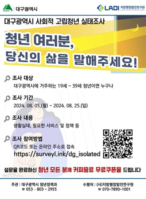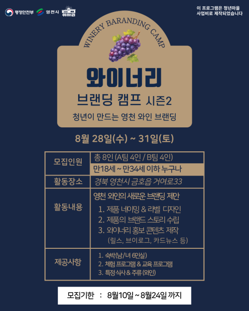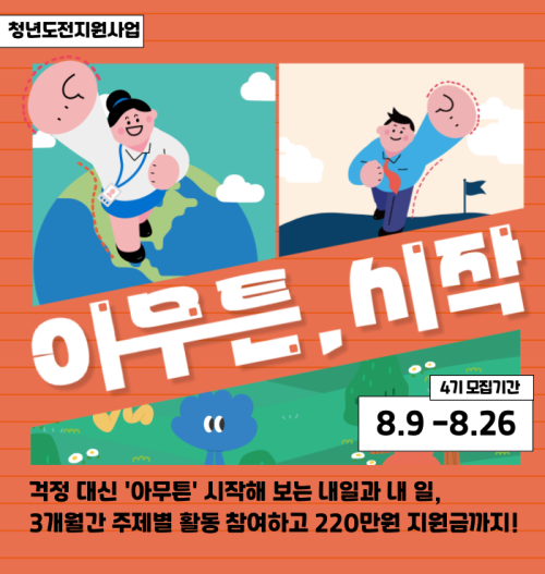 현재 모집 중 검색폼 대구광역시는 해당 페이지를 정보제공을 위한 목적으로 플랫폼을 운영하며, 각 게시글의 내용 및 운영방침에 대한 책임을 지지 않습니다. 대구광역시청년센터 사업 모아보기 전체보기 분야 : 전체 지원사업 채용/인턴/알바 기자단/서포터즈/자원봉사 공모전 교육/강연/토론 축제/공연/전시 커뮤니티활동 기타 정렬 : 전체 신규등록순 모집마감순 상태 : 전체 진행중 종료 기간 설정 검색 검색어 입력 꿀정보등록 누구나 쉽고 빠르게 청년정보를 등록하여 홍보할 수 있습니다. 전체선택 종료 취업특강 버크만 직무적성검사 참여자 모집 사단법인대구경북고용복지연구원 ~ 2024.08.26 대구광역시청년센터 종료 2024 청년생활종합상담사업 청년상담소 힐링프로그램 시즌 2 프로그램 참여자 모집 대구광역시청년센터 ~ 2024.08.26 종료 [청년도전지원사업] 아무튼,시작 4기 (~8/26, 올해 마지막 모집!) 구로 청년이룸 ~ 2024.08.26 종료 [선착순 마감 임박] 10일 만에 비개발자도 메타버스 AI휴먼 만들기 경북대학교 휴먼케어기술센터 메타버스허브 ~ 2024.08.25 종료 [SK행복나눔재단] 생계형 알바 청년 직업준비 지원 '내-일 러닝클럽' 5기 모집 행복나눔재단 ~ 2024.08.25 종료 2024년 「대구광역시 사회적 고립청년 실태조사」 (기간연장) 대구광역시 청년정책과 ~ 2024.08.25 종료 [수리부엉이 클럽] 팔현습지 탐방 참가자 모집 팔현습지를 지키는 예술행동 ~ 2024.08.24 종료 와이너리 브랜딩 캠프 시즌2 행정안전부 / 청년마을 취하리 ~ 2024.08.24 291 292 293 294 295 296 297 298 299 300
