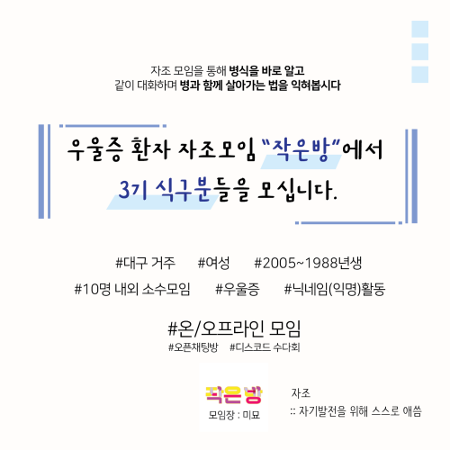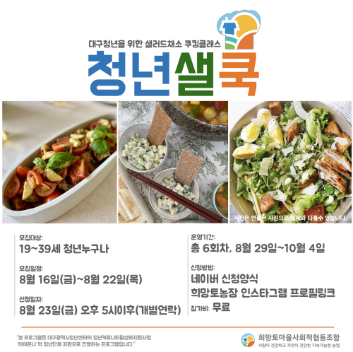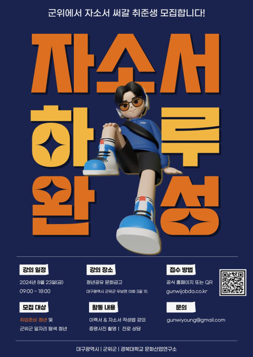 현재 모집 중 검색폼 대구광역시는 해당 페이지를 정보제공을 위한 목적으로 플랫폼을 운영하며, 각 게시글의 내용 및 운영방침에 대한 책임을 지지 않습니다. 대구광역시청년센터 사업 모아보기 전체보기 분야 : 전체 지원사업 채용/인턴/알바 기자단/서포터즈/자원봉사 공모전 교육/강연/토론 축제/공연/전시 커뮤니티활동 기타 정렬 : 전체 신규등록순 모집마감순 상태 : 전체 진행중 종료 기간 설정 검색 검색어 입력 꿀정보등록 누구나 쉽고 빠르게 청년정보를 등록하여 홍보할 수 있습니다. 전체선택 종료 자소서 하루 완성 경북대학교 문화산업연구소 ~ 2024.08.22 종료 대구지역인적자원개발위원회 직원 채용 공고 대구지역인적자원개발위원회(대구상공회의소) ~ 2024.08.22 종료 [참가자모집]대구청년 샐러드채소 쿠킹클래스: 청년샐쿡 with 어여온나 희망토 ~ 2024.08.22 종료 국토교통부 청년인턴 하반기 채용 국토교통부 ~ 2024.08.22 종료 [참가자 모집] 내가 기억하는 북성로를 굿즈로! 창작공간 ~ 2024.08.22 종료 [인생캠프] 잃어버린 나를 찾아 떠나는 근본투어 (8/23(금)~24(토), 1박2일) 웨즈덤인생학교 ~ 2024.08.22 종료 병과 함께 살아가는 나의 작은 방 #자조모임 작은방 ~ 2024.08.21 대구광역시청년센터 종료 2024 청년활력공간 다온나그래 공간운영단 모집 대구광역시청년센터 ~ 2024.08.21 291 292 293 294 295 296 297 298 299 300