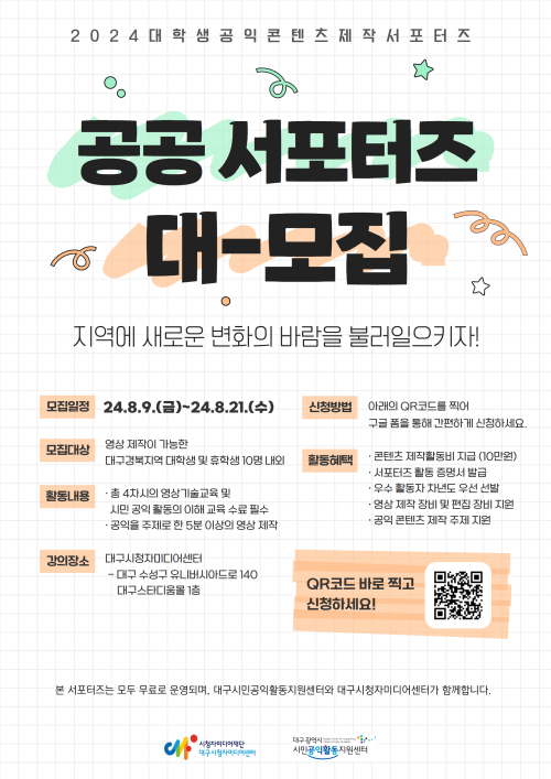 현재 모집 중 검색폼 대구광역시는 해당 페이지를 정보제공을 위한 목적으로 플랫폼을 운영하며, 각 게시글의 내용 및 운영방침에 대한 책임을 지지 않습니다. 대구광역시청년센터 사업 모아보기 전체보기 분야 : 전체 지원사업 채용/인턴/알바 기자단/서포터즈/자원봉사 공모전 교육/강연/토론 축제/공연/전시 커뮤니티활동 기타 정렬 : 전체 신규등록순 모집마감순 상태 : 전체 진행중 종료 기간 설정 검색 검색어 입력 꿀정보등록 누구나 쉽고 빠르게 청년정보를 등록하여 홍보할 수 있습니다. 전체선택 종료 대학생 공익 콘텐츠 제작단, 공공 서포터즈 모집! (~8월 21일까지) 시청자미디어재단 대구시청자미디어센터 ~ 2024.08.21 종료 Eagle CAD를 이용한 PCB 설계 (재)대구테크노파크 스타트라인 ~ 2024.08.21 종료 2024 Good Job 온라인 취업캠프 참가자 모집 고용노동부, 한국공학대학교 대학일자리플러스센터 ~ 2024.08.21 종료 사상 최초! 해커톤 취업캠프 신청하고 꿈의 직장으로 GO! [2024년 청년테마별 취업지원사업 ] 파워풀 청년 JOB 해커톤 (주)클라인 ~ 2024.08.20 종료 남구청년센터 채용공고 남구청년센터 ~ 2024.08.20 종료 2024 예술로 어울림 사업 l 취향의 숲 l 남구편 시즌 2 (사)대구스트릿컬쳐팩토리 ~ 2024.08.19 종료 취업특강 버크만 직무적성검사 참여자 모집 사단법인대구경북고용복지연구원 ~ 2024.08.19 종료 2024년 대구청년 슬기로운 직장생활 지원사업_[직장생활 처음이지 2기] 대구광역시, (재)대구창조경제혁신센터 ~ 2024.08.19 291 292 293 294 295 296 297 298 299 300